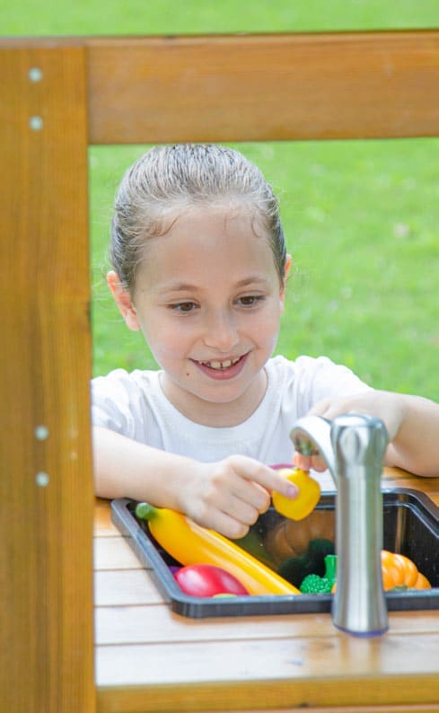 Mit ihren vier Kochfeldern und dem funktionsfähigen Wasserhahn aus Edelstahl, der sich direkt an einen Gartenschlauch anschließen lässt, erleben Kinder ein realistisches Spielerlebnis, das ihre Fantasie anregt und alltägliche Handlungen nachahmen lässt. Die kindgerechte Spielhöhe ermöglicht bequemes und sicheres Spielen – auch für mehrere Kinder gleichzeitig.