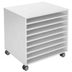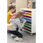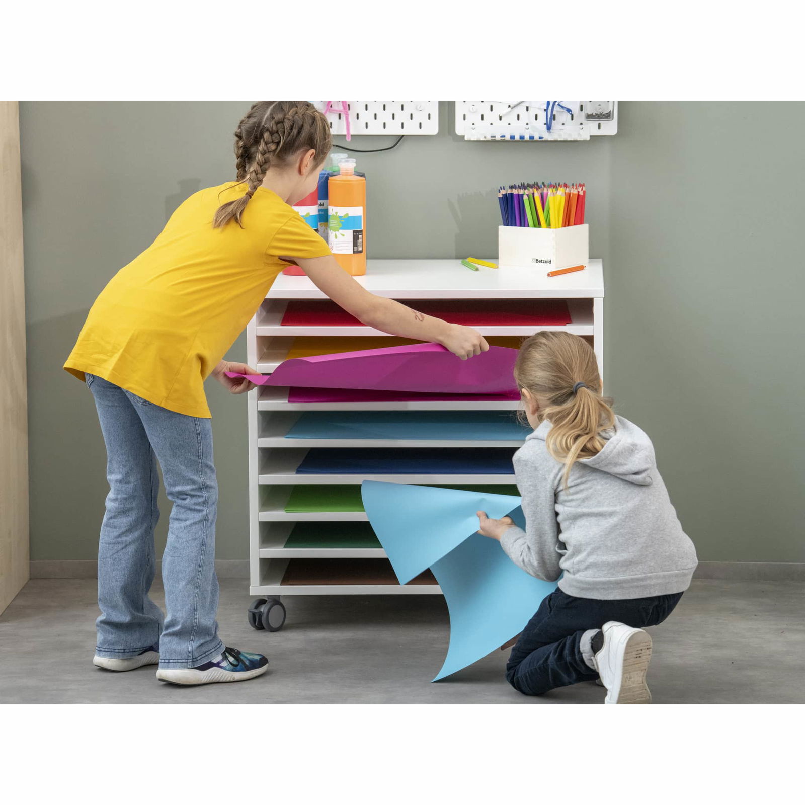 Der Papierwagen für Papier, liegend, ist die perfekte Lösung für Schulen, Kindergärten und kreative Einrichtungen, die Wert auf Ordnung und Flexibilität legen. Mit acht großzügigen Fächern bietet er ausreichend Stauraum für Papier in DIN-A2-Größe und sorgt dafür, dass Materialien jederzeit griffbereit sind. Dank seiner vier stabilen Rollen und der kompakten Größe lässt sich der Wagen bequem bewegen, sodass er sich hervorragend für den Einsatz in großen oder wechselnden Räumen eignet. Zwei der Rollen sind arretierbar, um bei Bedarf einen sicheren Stand zu gewährleisten.