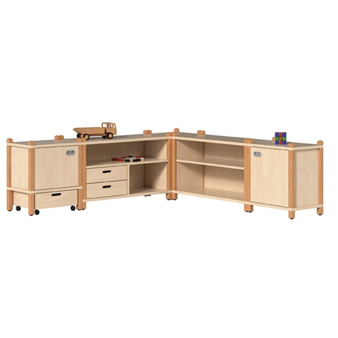Schaffen Sie eine Organisationslandschaft, die so dynamisch und vielseitig ist wie der Alltag mit Kindern. Das PAUL Regalsystem ist eine meisterhafte Eck-Kombination, die auf intelligente Weise verschiedene Aufbewahrungslösungen in einem harmonischen, markanten Design vereint. Dieses fünfteilige Set bietet alles, was für eine umfassende Raumorganisation benötigt wird: einen mobilen Rollkasten für großes Spielzeug, hochwertige Massivholzschübe für Kleinteile, offene Regale für schnellen Zugriff und geschlossene Schränke für ein aufgeräumtes Erscheinungsbild. Dank des cleveren Innenecktürmchens werden auch schwierige Raumecken optimal genutzt. Basierend auf dem bewährten, werkzeuglos erweiterbaren Stollensystem und mit TÜV- sowie GS-Zertifizierung versehen, ist PAUL die erste Wahl für Kitas, Schulen und Horte, die Wert auf Sicherheit, Flexibilität und Langlebigkeit legen.
