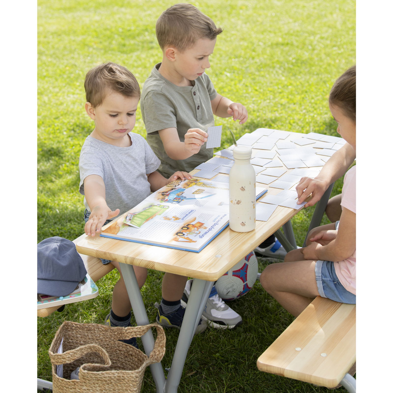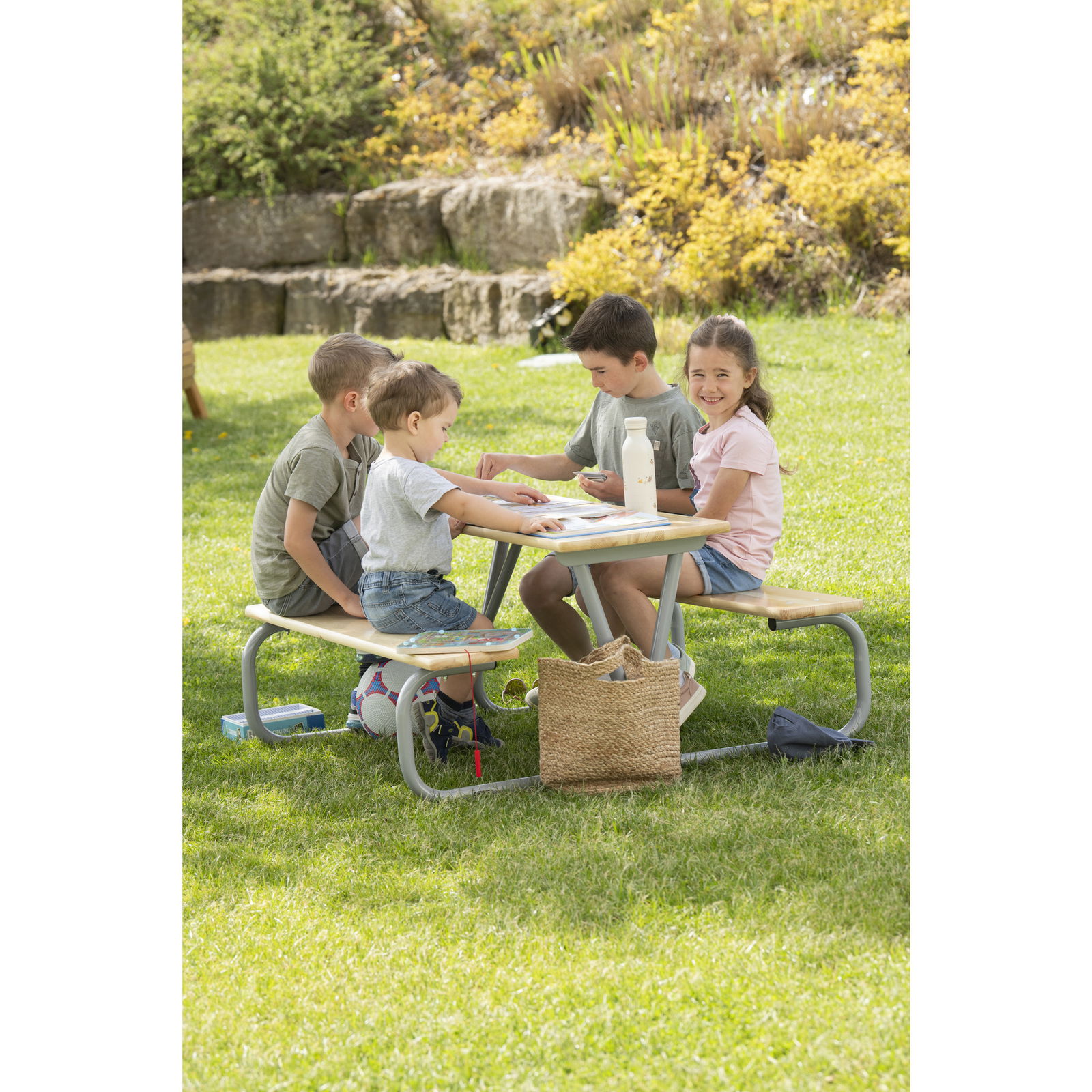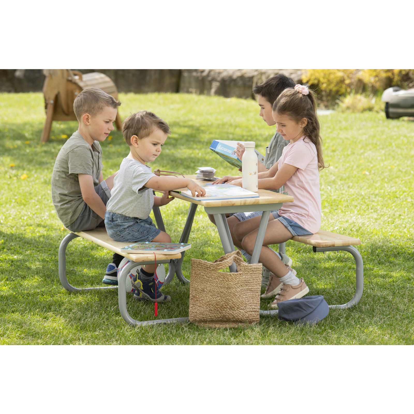 Die großzügige Tischplatte (110 x 110 cm Gesamtmaß der Gruppe) bietet reichlich Fläche für Malbücher, Snacks oder Brettspiele. Da bis zu sechs Kinder gleichzeitig an der Garnitur sitzen können, fördert sie das soziale Miteinander und ist ideal für Kindergeburtstage oder den Spielnachmittag mit Freunden. - Vielseitig einsetzbar – Drinnen wie Draußen