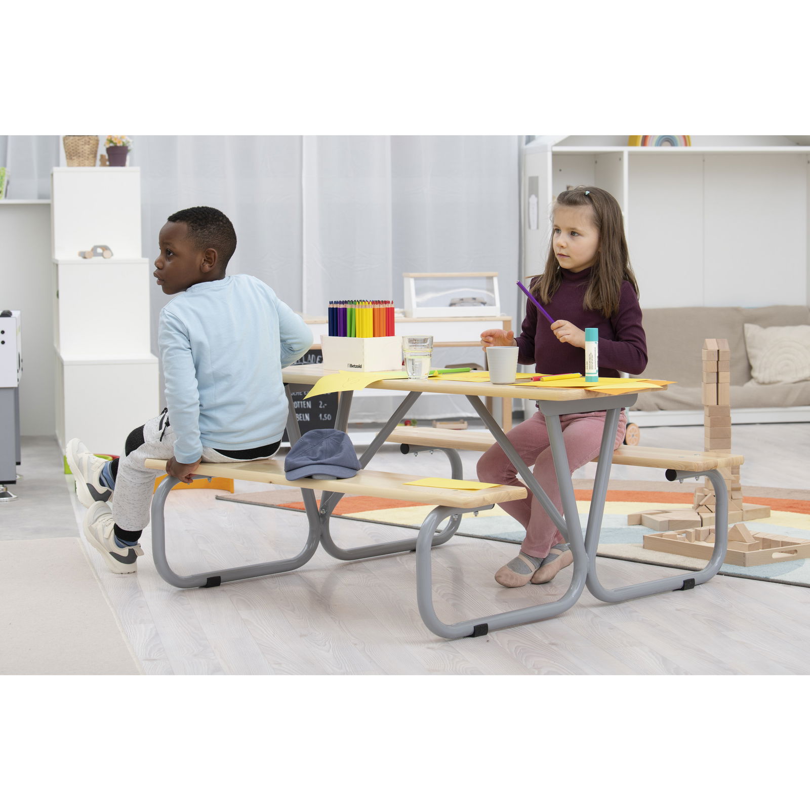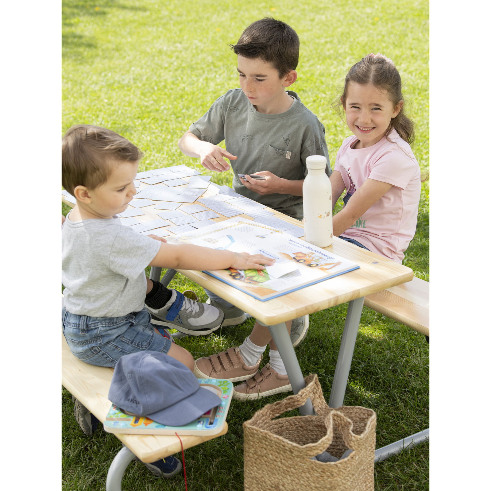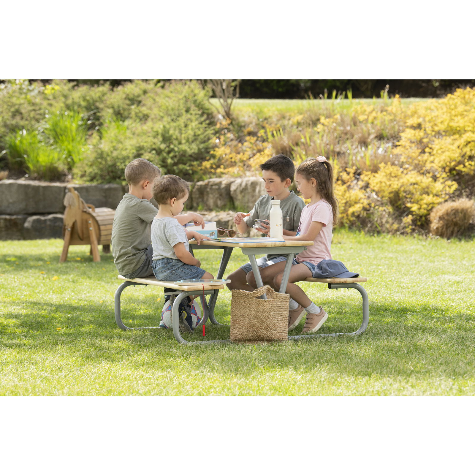 Die großzügige Tischplatte (110 x 110 cm Gesamtmaß der Gruppe) bietet reichlich Fläche für Malbücher, Snacks oder Brettspiele. Da bis zu sechs Kinder gleichzeitig an der Garnitur sitzen können, fördert sie das soziale Miteinander und ist ideal für Kindergeburtstage oder den Spielnachmittag mit Freunden. - Vielseitig einsetzbar – Drinnen wie Draußen