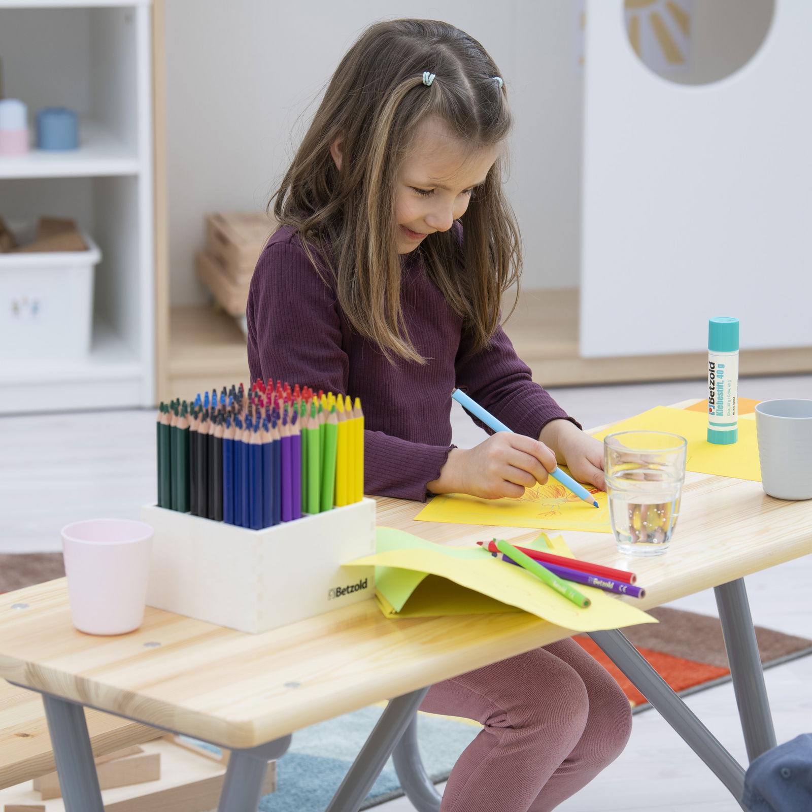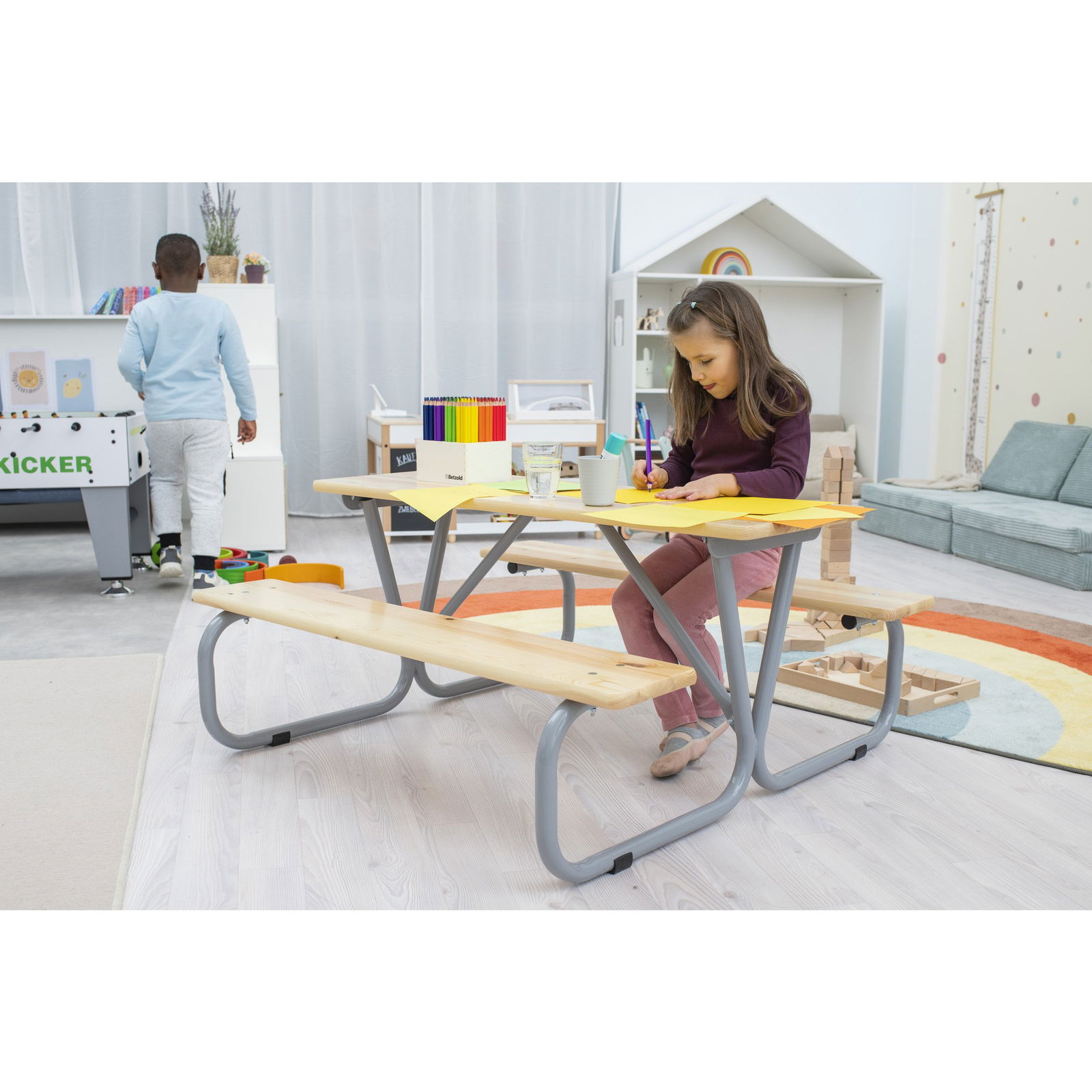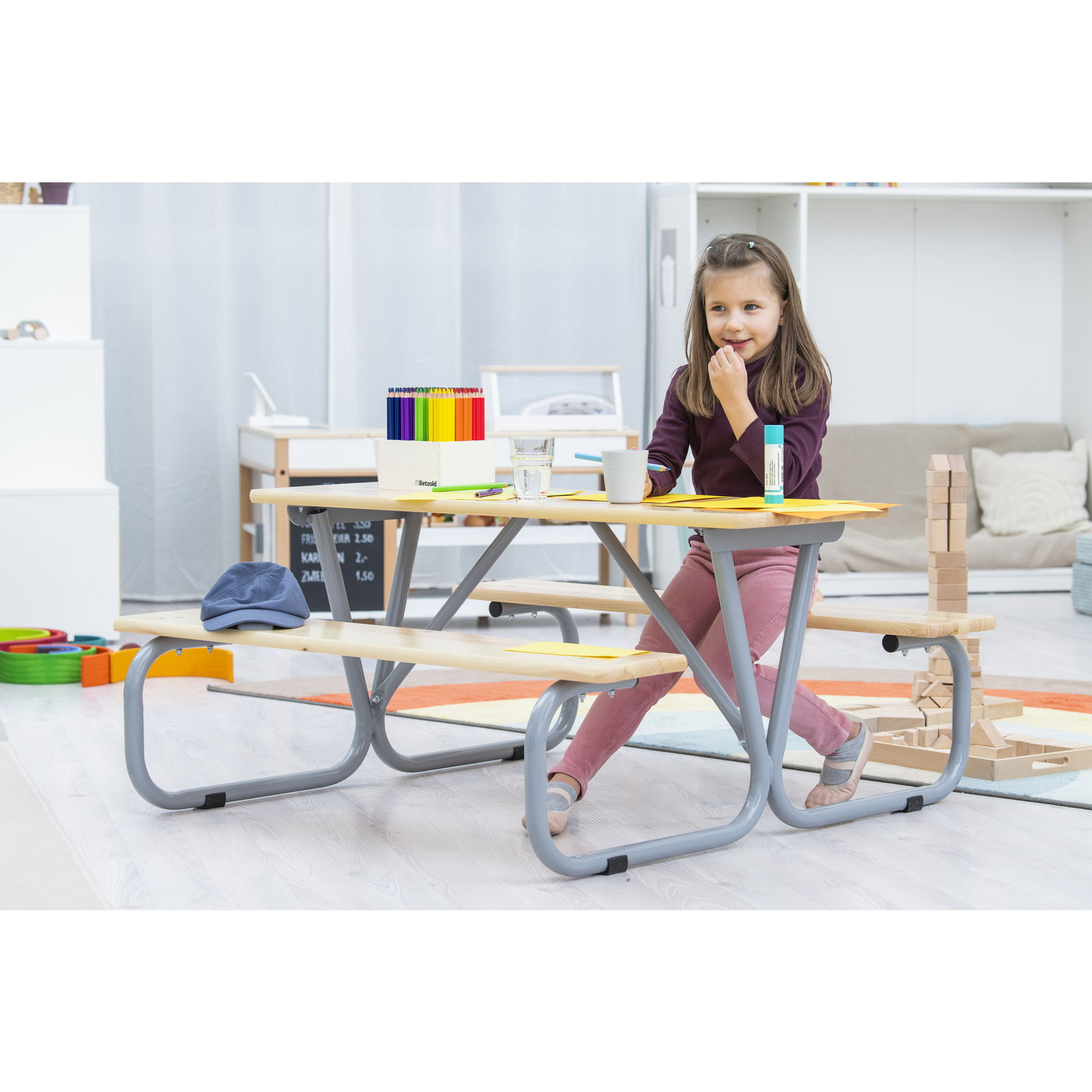 Obwohl sie für den Außenbereich konzipiert ist, macht die Sitzgruppe „Michel“ auch im Innenbereich eine gute Figur. Im Winter oder bei schlechtem Wetter kann sie problemlos im Spielzimmer oder Wintergarten genutzt werden und dient dort als robuster Bastel- und Maltisch.