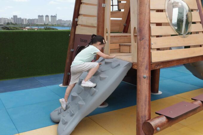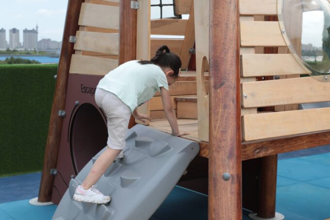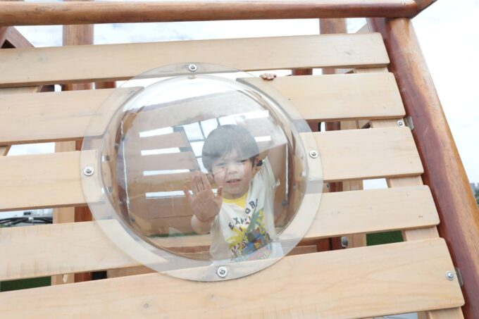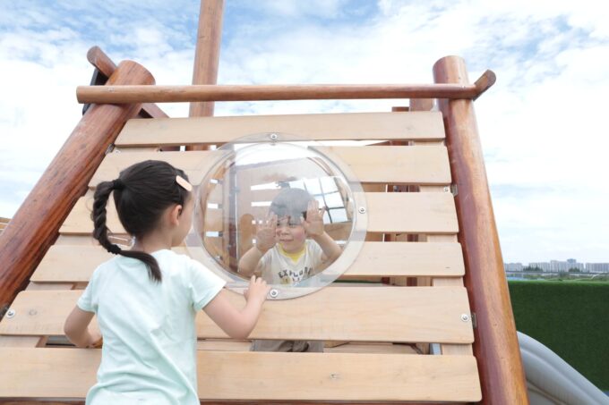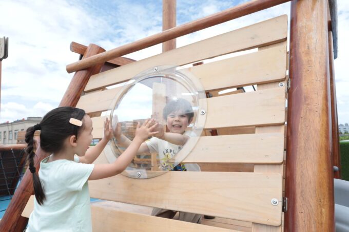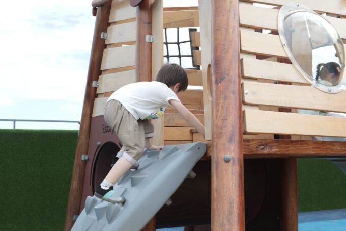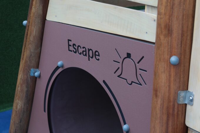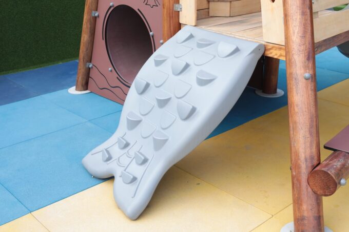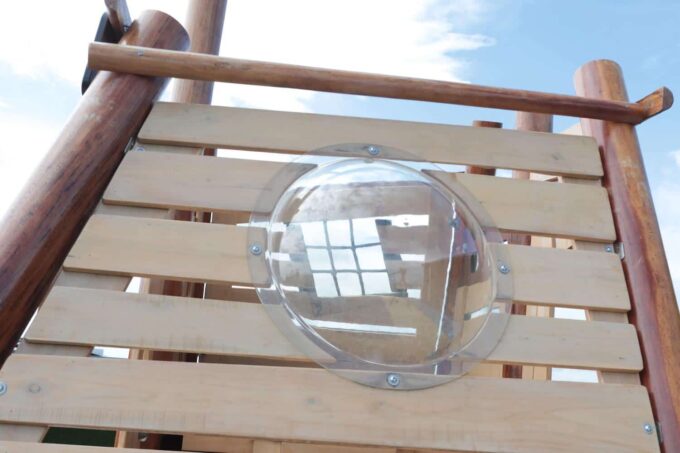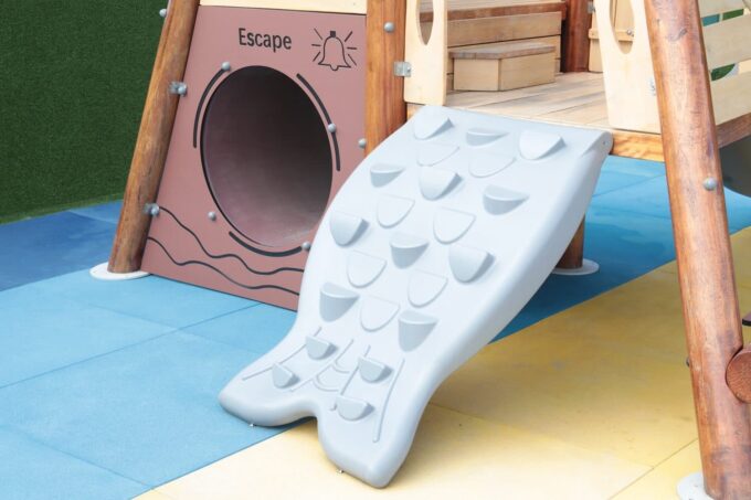 - ausgestattet mit einem Bullauge, Rutsche, Kriechtunnel und Kletterrampe