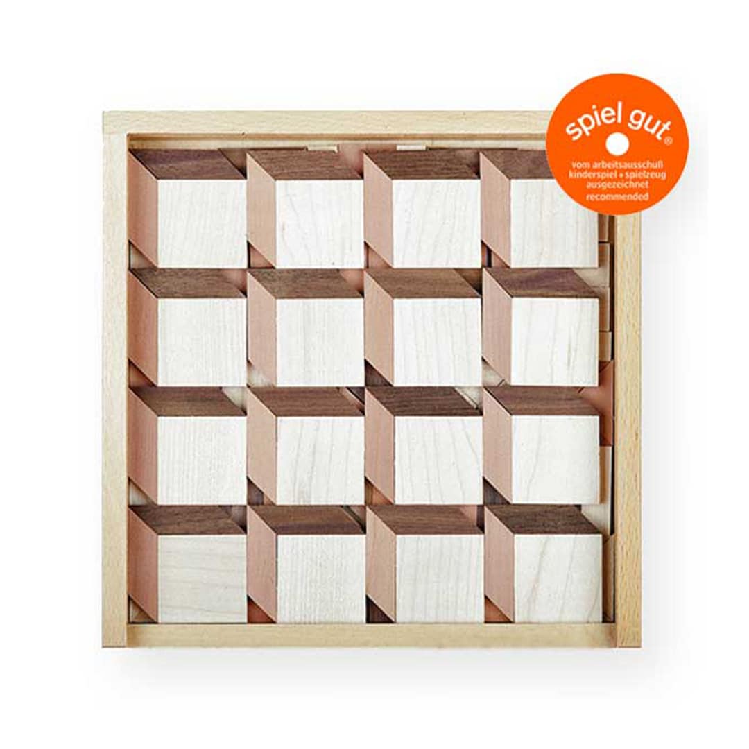 Entdecken Sie das Geschicklichkeitsspiel, das ein Stück der erzgebirgischen Spielzeugmacherkunst des frühen 20. Jahrhunderts in Ihre Hände legt. Dieses Legespiel ist eine Neuauflage historischer Schätze und vereint die Eleganz dreier europäischer Edelhölzer – Ahorn, Birnbaum und Nussbaum. Die natürlichen Farbschattierungen dieser Hölzer reichen von hellem bis zu dunklem Ton und schaffen beim Zusammensetzen der Motive eine beeindruckende dreidimensionale Optik.