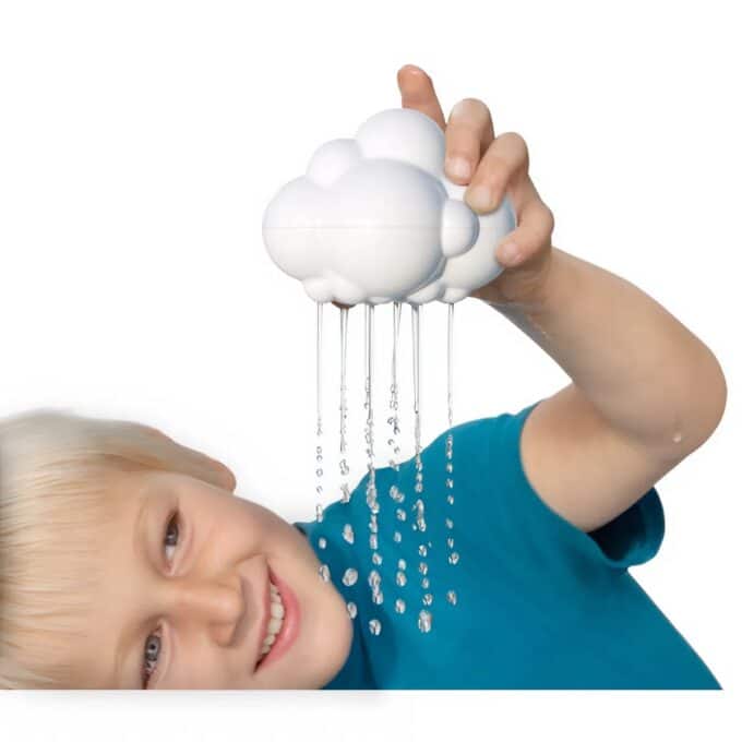 Nun kommt der magische Moment: Verschließt man das Loch an der Oberseite mit einem Finger, bleibt das Wasser wie von Zauberhand in der Wolke gefangen. Nimmt man den Finger weg, beginnt es sanft aus den kleinen Öffnungen an der Unterseite zu regnen. Dieses einfache Prinzip aus Ursache und Wirkung fasziniert schon die Allerkleinsten und lädt zum Experimentieren ein. Ob als sanfte Dusche für die Lieblingsbadetiere, zum Gießen der Blumen auf dem Balkon oder einfach nur zum Beobachten des plätschernden Wassers – die Plui Regenwolke inspiriert zu fantasievollem und lehrreichem Spiel.