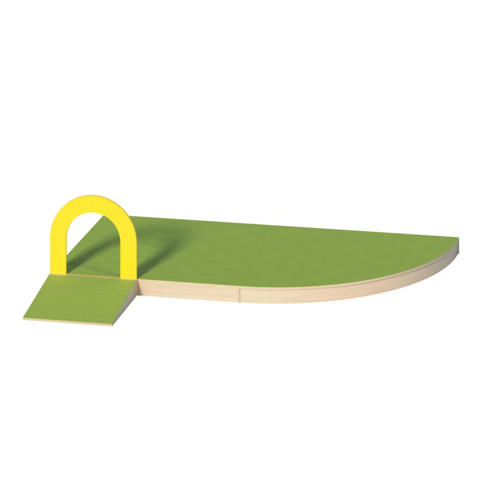 Die Podestanlage besteht aus einer Rampe (P2-713), einem Podestdurchgang (PD-113), einem geschlossenen Quadratpodest (P5-113) und einem großen Viertelkreispodest (P16-113). Diese Elemente schaffen eine lebendige und dynamische Umgebung, die zum Entdecken und Spielen einlädt. Die Rampe und der Durchgang bieten spannende Kletter- und Kriechrouten, während das Quadrat- und Viertelkreispodest ideale Plattformen zum Bauen, Lesen und Entspannen darstellen.