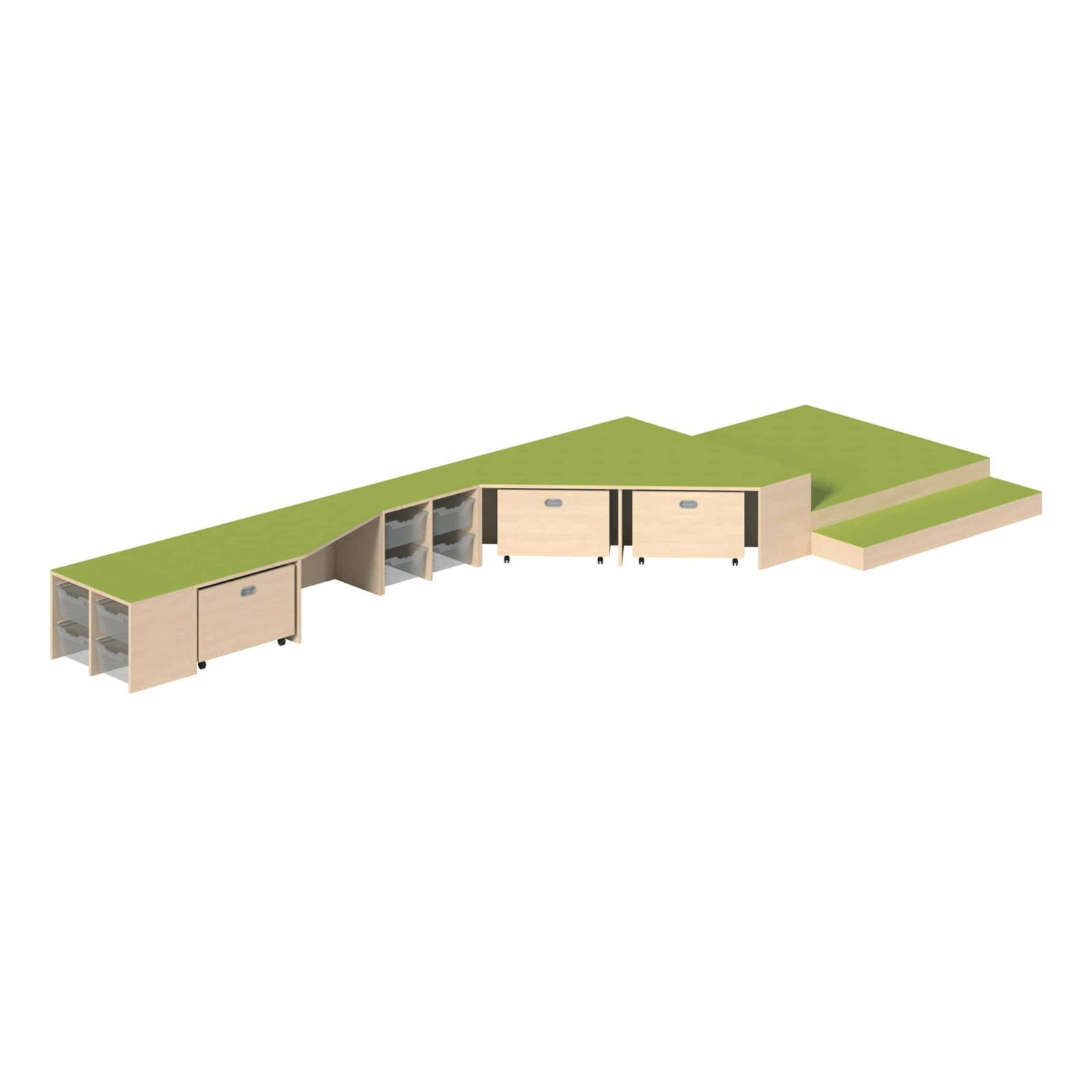 Die Podestanlage besteht aus zwei ErgoTray Podesten (P4-446), einem Podest mit Abschrägung (P10-146), einem Eckpodest für zwei Rollkästen (P6-146), einem geschlossenen Quadratpodest (P5-124) und einem schmalen Rechteckpodest (P3-113). Diese verschiedenen Elemente schaffen eine spannende und sichere Umgebung, die zum Klettern, Spielen und Entspannen einlädt. Zwei Rollkästen PR-146 und ein größerer Rollkasten PR-246 bieten zusätzlichen Stauraum, sodass Materialien und Spielzeug ordentlich verstaut werden können.