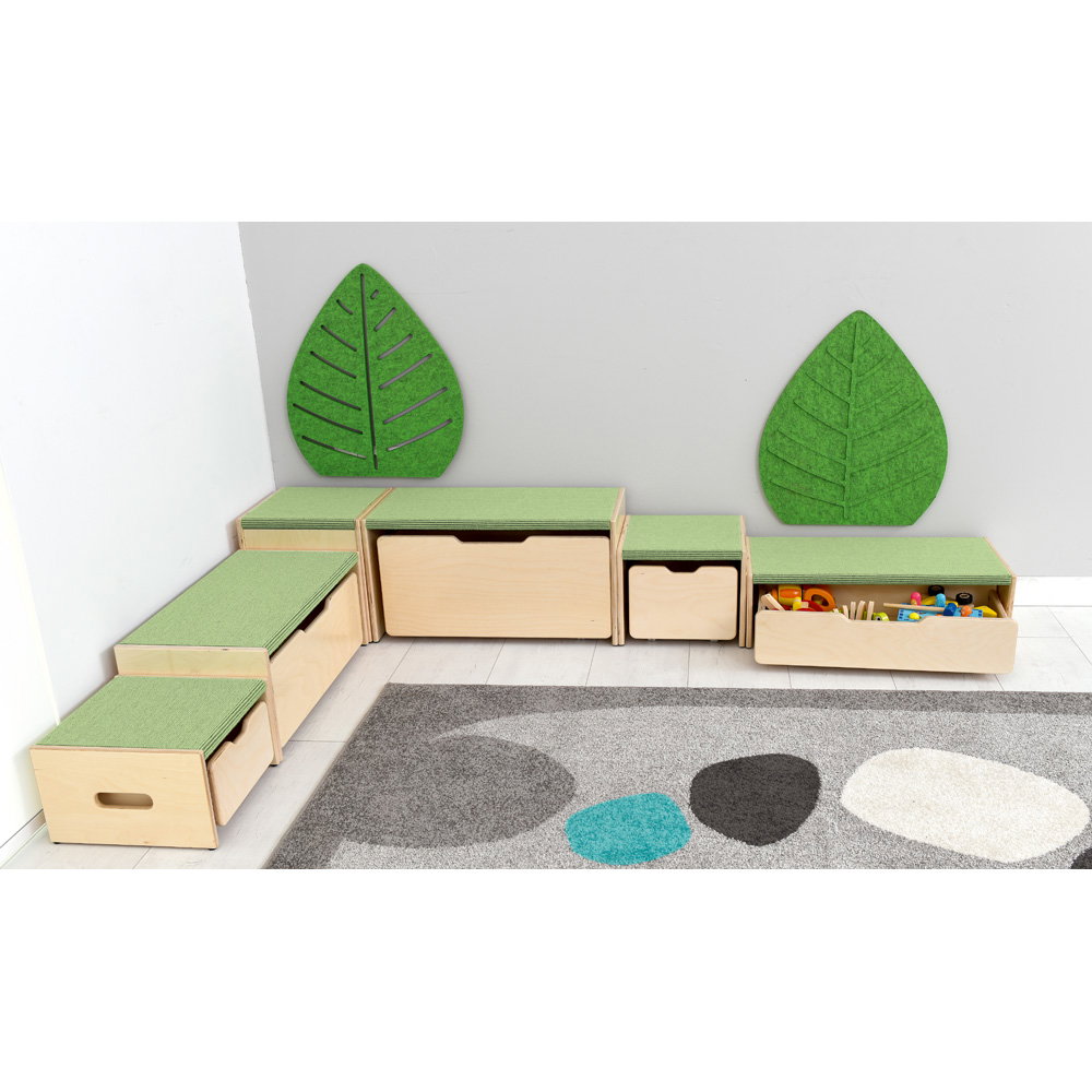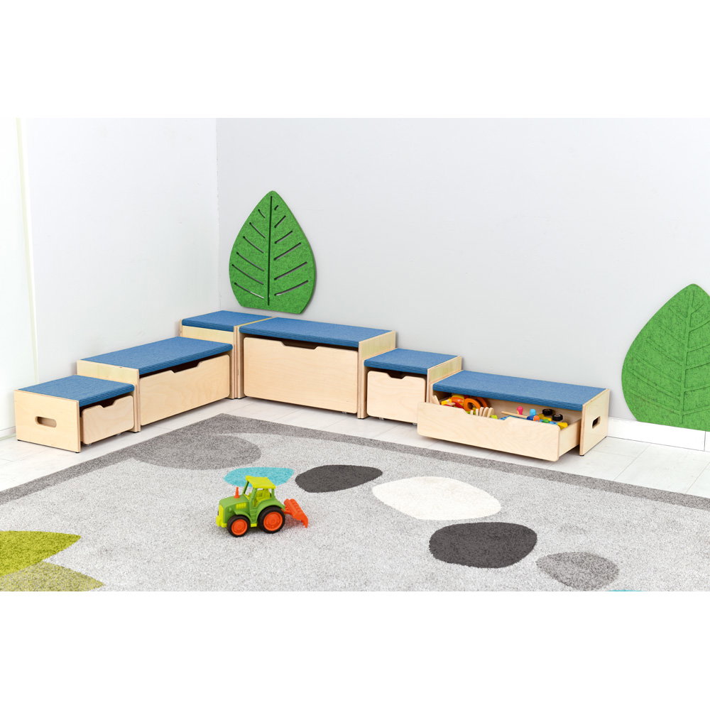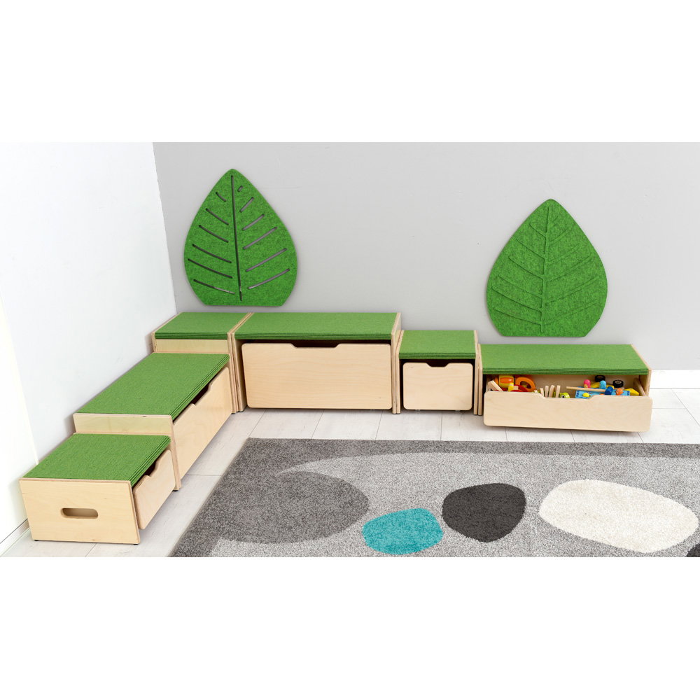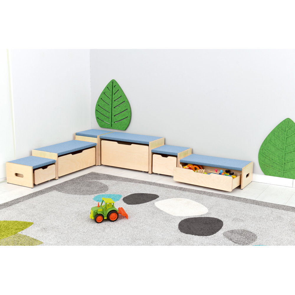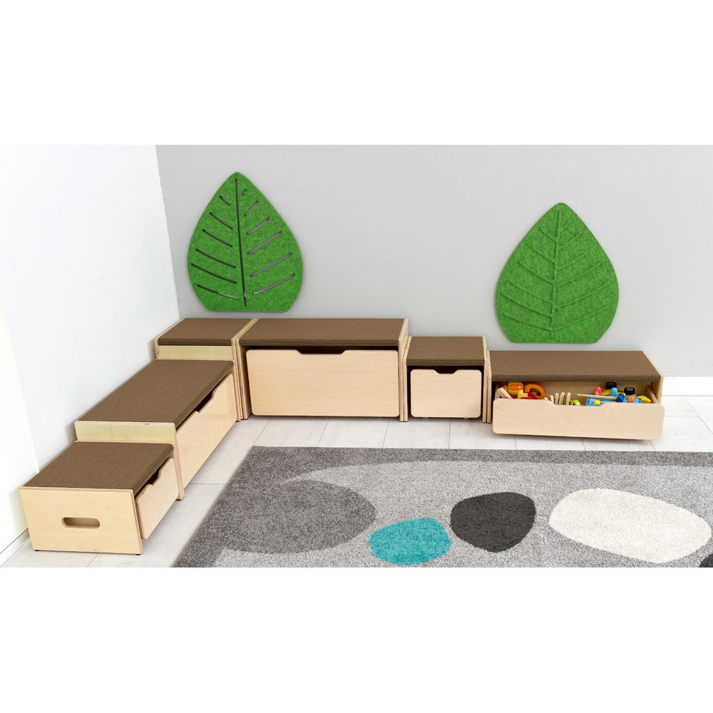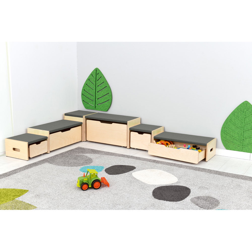 Die Kombination aus drei breiteren Bänken und drei quadratischen Sitzen ermöglicht Ihnen eine hervorragende Raumnutzung und maximale Flexibilität. Jedes einzelne Element ist aus stabilem Holz gefertigt, das den hohen Anforderungen des Alltags mühelos standhält. Die Oberflächen sind mit einem hochwertigen, rutschfesten tretford-Teppichbelag ausgestattet. Dieses Material bietet den Kindern nicht nur einen sicheren Halt beim Klettern und Balancieren, sondern fühlt sich auch beim Sitzen angenehm warm an. Zudem trägt der Teppich zu einer besseren Raumakustik bei, indem er Spielgeräusche sanft dämpft.