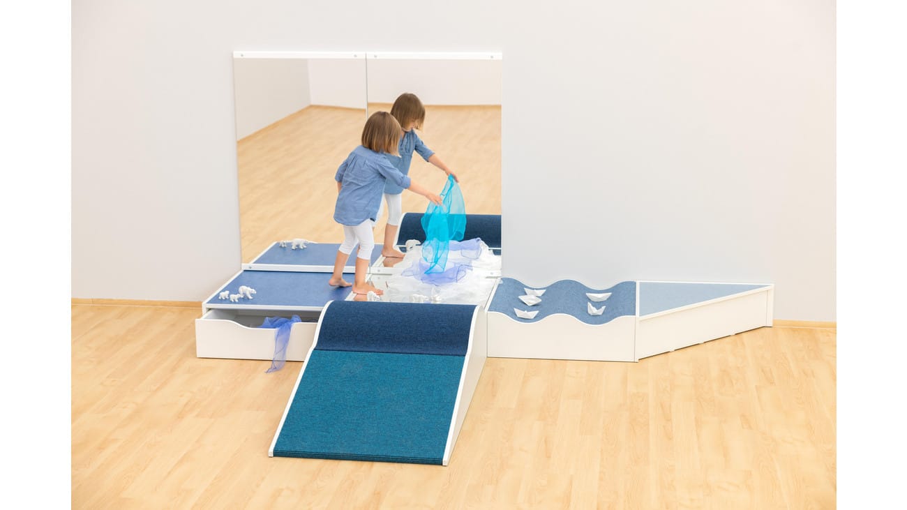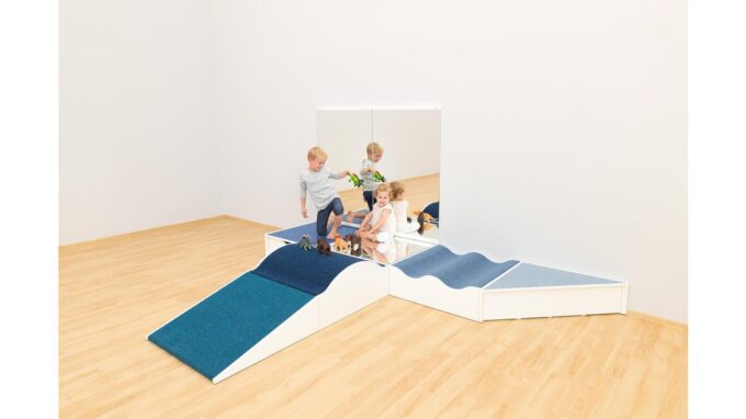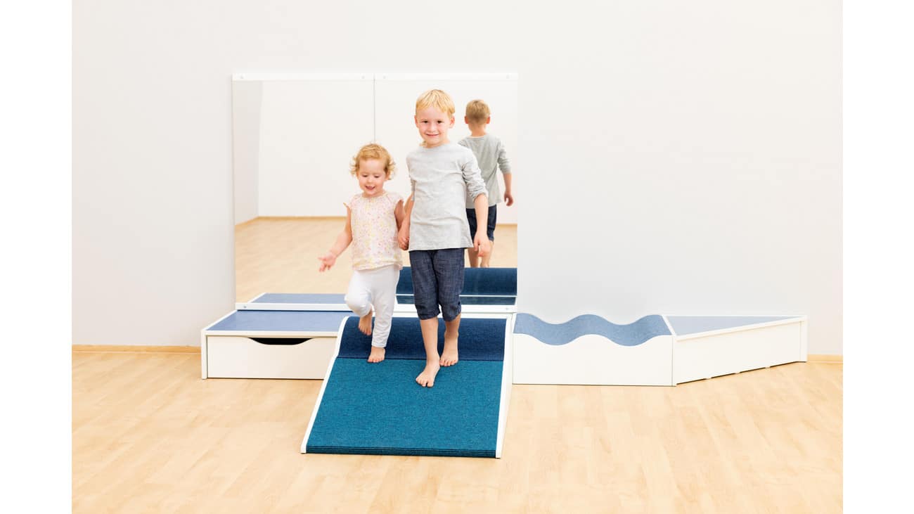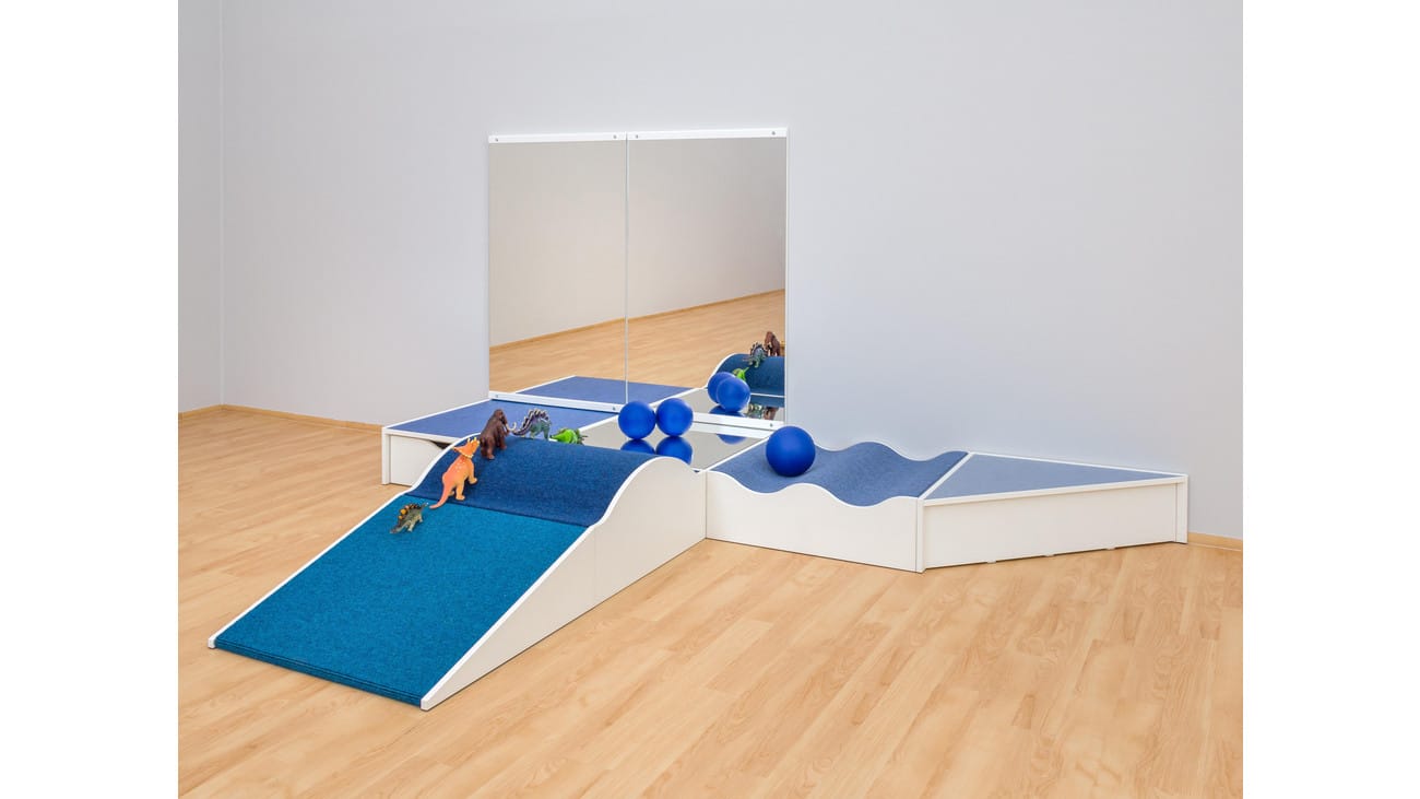 Mit seiner intelligenten Struktur lädt das Podeste-Set „Emil“ zum Klettern, Rutschen und Erforschen ein. Von der Rampe über den Hügel bis zur Welle – die unterschiedlichen Ebenen bieten zahlreiche Möglichkeiten für Abenteuer und Bewegungsförderung. Besonders aufregend ist der große Wandspiegel aus Sicherheitsglas, der die Selbstwahrnehmung der Kinder fördert und sie dazu anregt, ihre Umgebung zu erkunden. Hier macht das Spielen gleich doppelt Spaß!