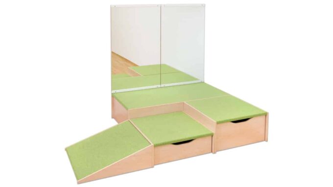 Ein Highlight des Sets sind die zwei Wandspiegel. Sie fördern nicht nur die Selbstwahrnehmung der Kinder, sondern laden auch zum spannenden Spiel und Experimentieren ein. Die Kinder können in die Spiegel schauen, ihre Reflexionen beobachten und sogar Figuren im Spiel darstellen. Auch die Podeste bieten eine sichere Fläche, um sie beim Spielen und Forschen zu unterstützen, und deren rutschfeste Oberfläche gibt zusätzlich Sicherheit.