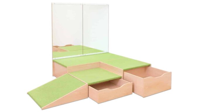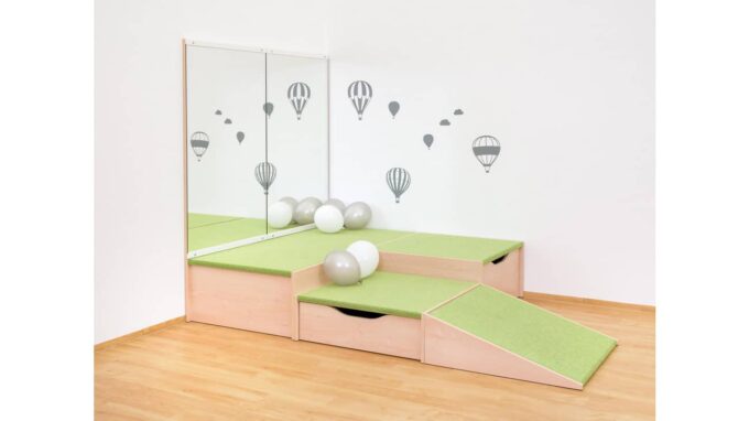 Ein Highlight des Sets sind die zwei Wandspiegel. Sie fördern nicht nur die Selbstwahrnehmung der Kinder, sondern laden auch zum spannenden Spiel und Experimentieren ein. Die Kinder können in die Spiegel schauen, ihre Reflexionen beobachten und sogar Figuren im Spiel darstellen. Auch die Podeste bieten eine sichere Fläche, um sie beim Spielen und Forschen zu unterstützen, und deren rutschfeste Oberfläche gibt zusätzlich Sicherheit.