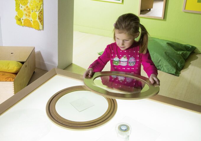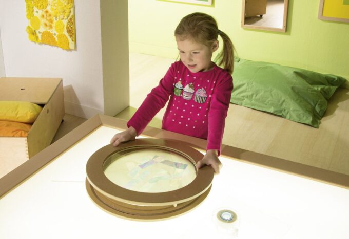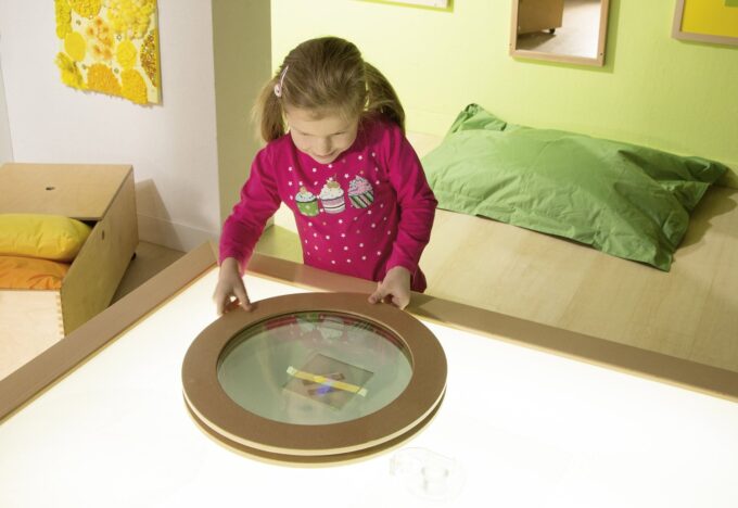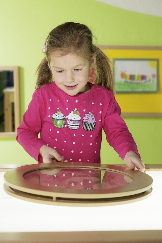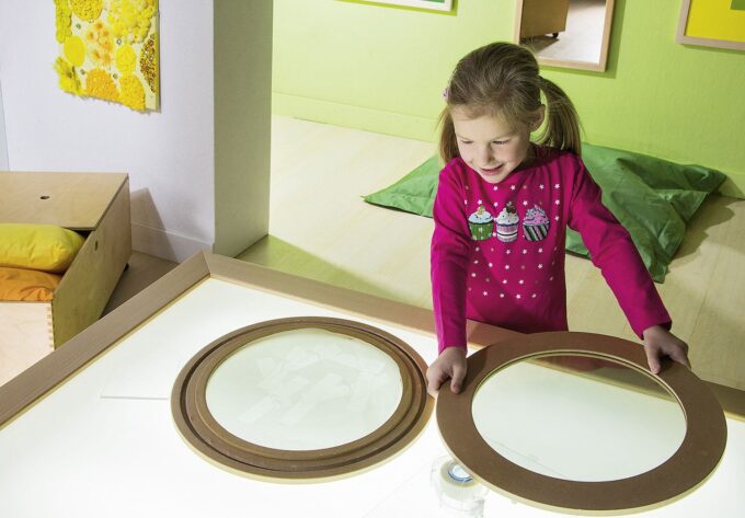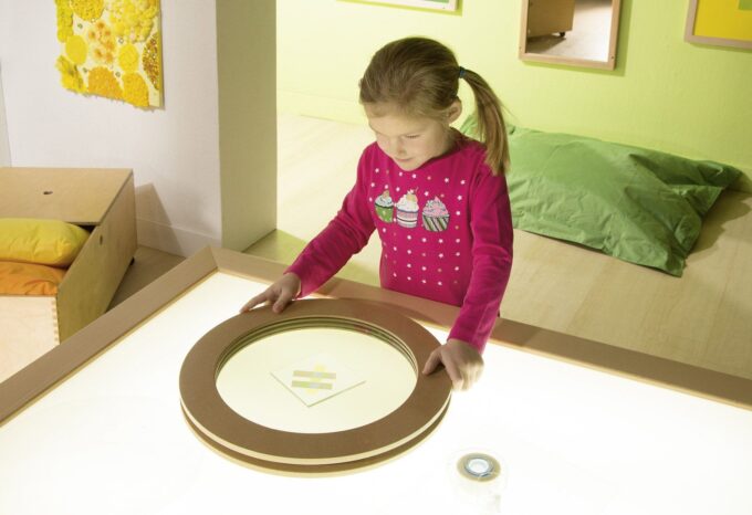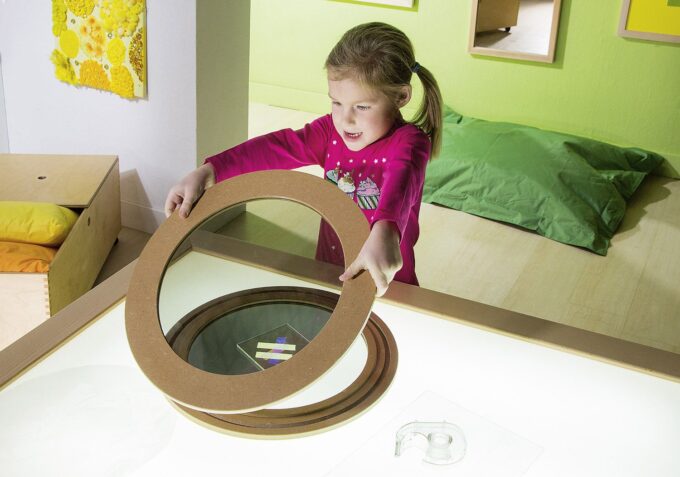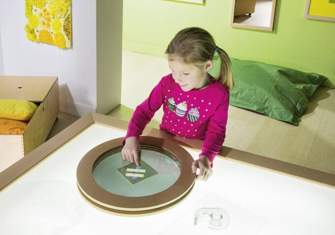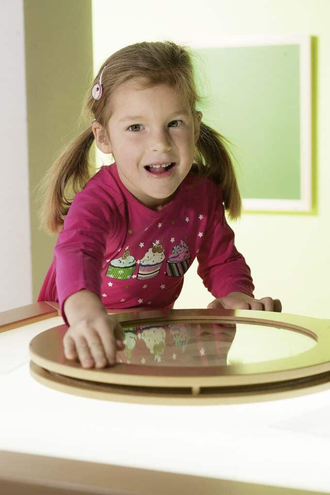 - Experimentierfreude wecken: Kinder können durch das Drehen und Kombinieren der Acrylscheiben sowie durch die Wahl der Materialien immer neue Effekte erzielen.