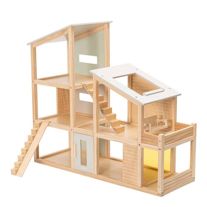 Hergestellt aus hochwertigem Holz und versehen mit einem modernen, klaren Design in sanften Farben wie mintgrün und hellgrau, fügt sich das Puppenhaus harmonisch in jedes Kinderzimmer ein. Die gelbe Acrylglasscheibe auf der Rückseite lässt viel Tageslicht in die Räume strömen und sorgt für eine gemütliche Atmosphäre. Die Kombination aus funktionalen Elementen und ästhetischem Design macht das Puppenhaus zu einem echten Hingucker.