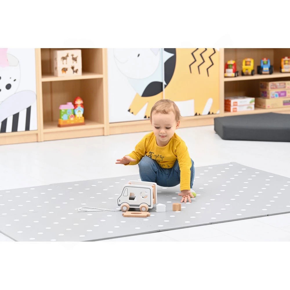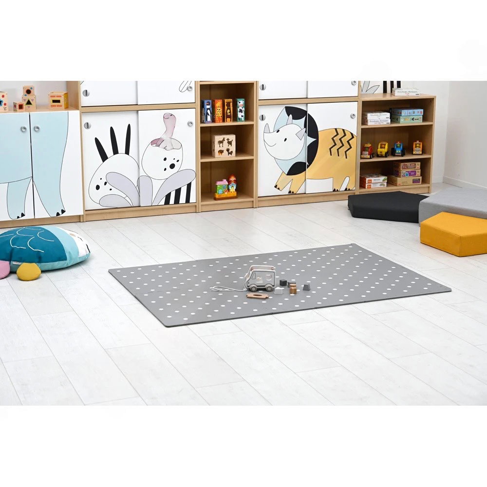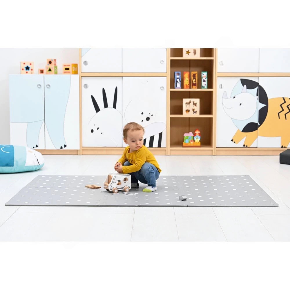 Das clevere Design erlaubt es, die einzelnen quadratischen Fliesen immer wieder neu zu kombinieren. Ob als großer flacher Spielteppich, als lange Turnbahn oder sogar dreidimensional als riesiger Würfel zusammengesetzt – der Fantasie sind keine Grenzen gesetzt. Das fröhliche Punktemuster sorgt dabei für optische Abwechslung, ohne unruhig zu wirken. Eltern schätzen besonders die praktischen Eigenschaften: Die Matte ist wasserabweisend, leicht zu reinigen und isoliert hervorragend gegen Bodenkälte. So können die Kleinen auch im Winter barfuß spielen, ohne zu frieren.