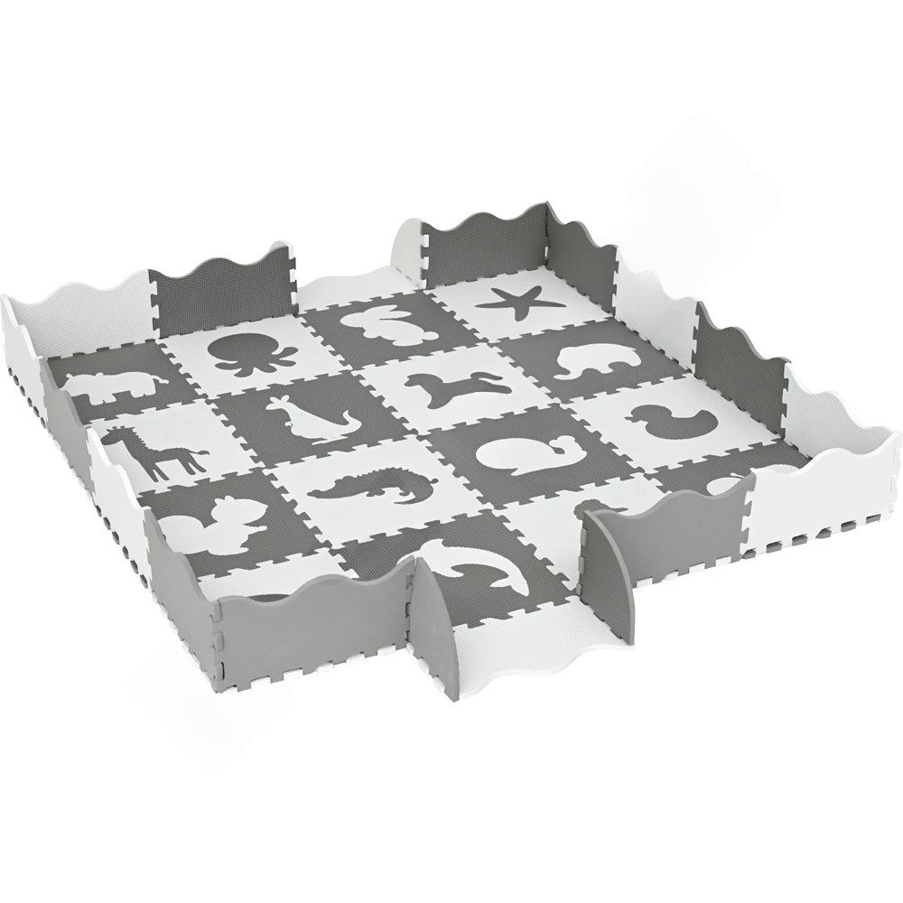 Die innovativste Funktion dieser Matte ist die umbaubare Umrandung. Legen Sie sie flach für eine riesige 150 x 150 cm große Spielfläche oder stellen Sie die 20 Randfliesen hoch, um einen geschützten und gemütlichen Spielbereich zu schaffen. Ideal für die ersten Monate, um Ihrem Baby einen sicheren Raum zu geben. - Spielerisches Lernen mit der Tierwelt