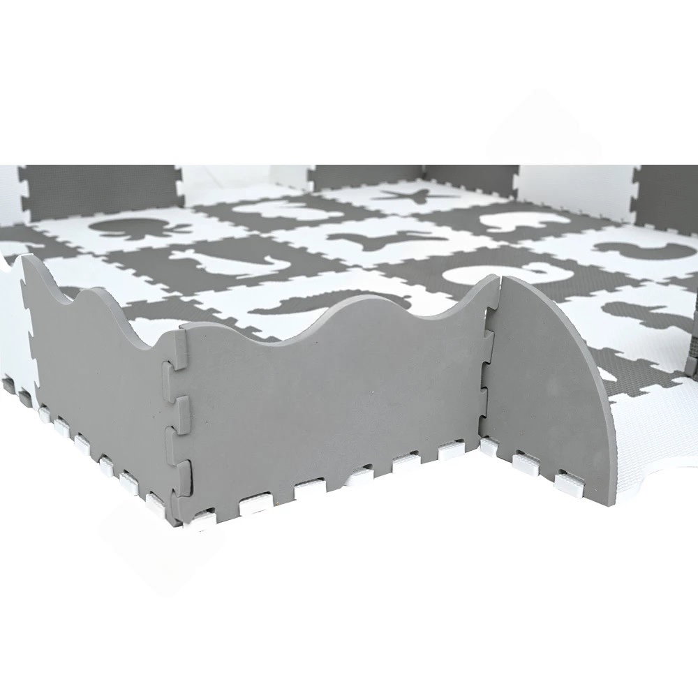 Das Besondere an diesem Set ist seine unglaubliche Vielseitigkeit. Aus einem flachen Spielteppich wird im Handumdrehen eine sichere Krabbelecke. Die cleveren Randfliesen können einfach hochkant aufgestellt werden und bilden so einen geschützten Rahmen, der Babys und Kleinkindern Geborgenheit schenkt. Zwei clevere Eck-Rand-Fliesen schaffen dabei kleine Eingänge, sodass die Kleinen ihre Spieloase selbstständig erkunden können. So entsteht ein sicherer Raum, in dem Kinder ungestört die Welt der Tiere entdecken, während Eltern entspannt bleiben können.