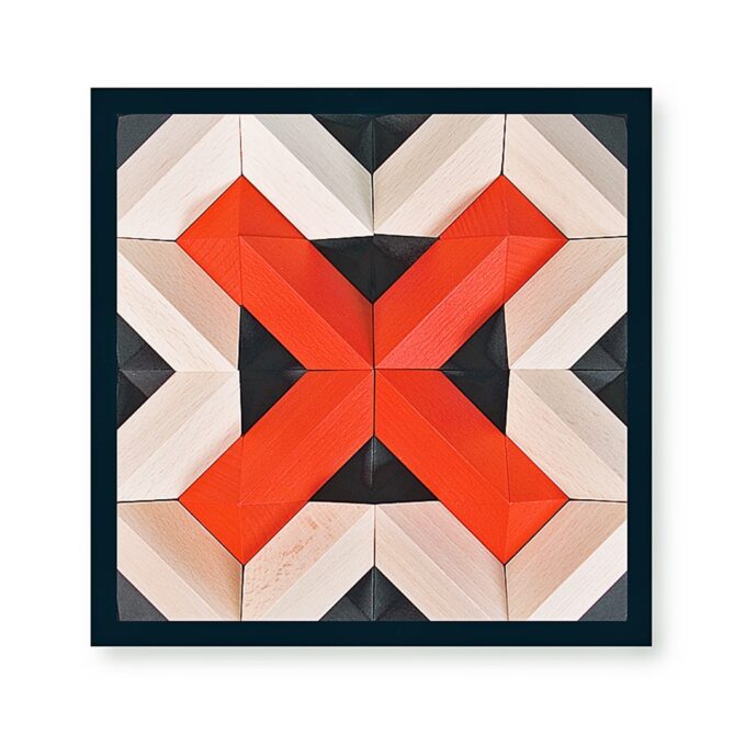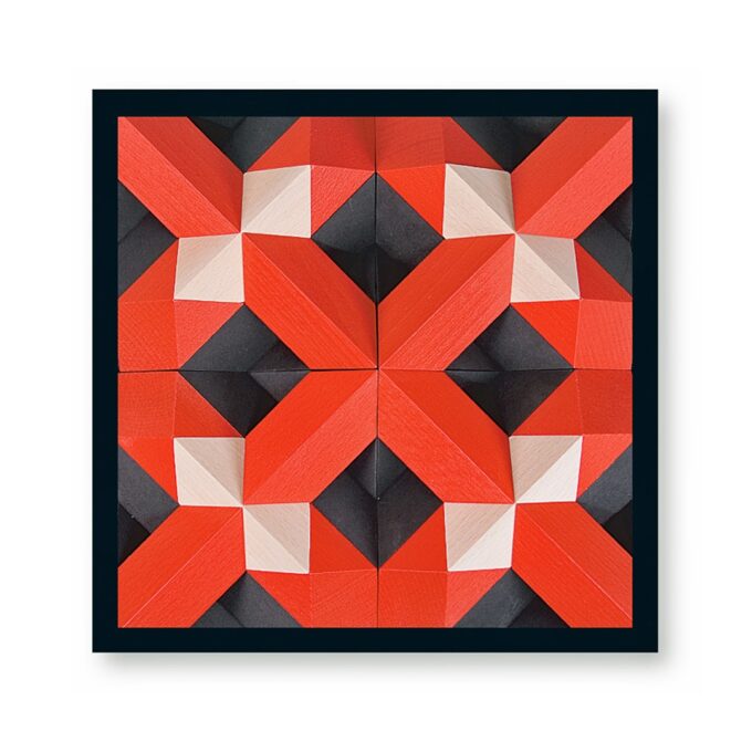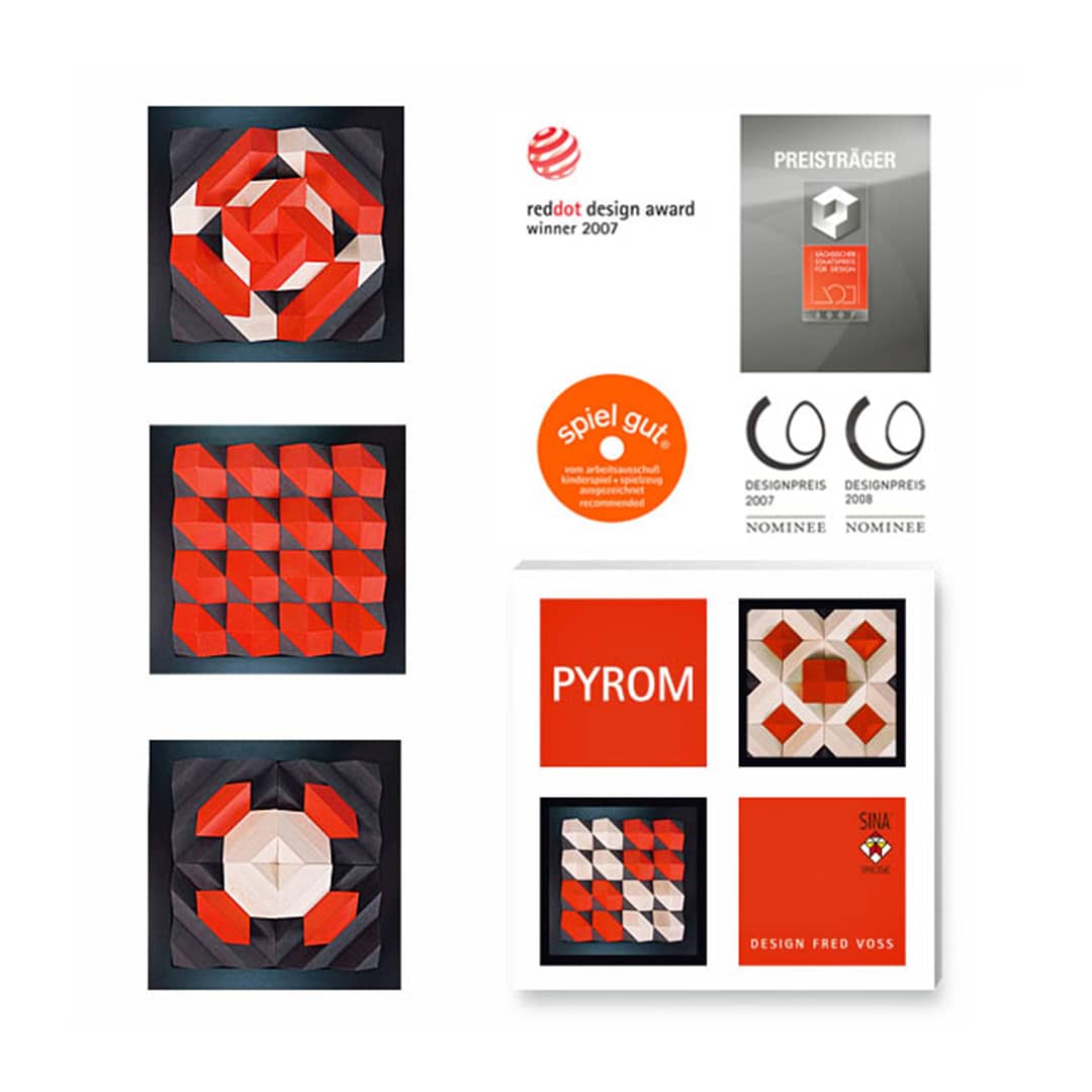 Geometrie in faszinierender Schönheit spielend erleben, das ist PYROM. Der Elementarbaustein wurde auf der Grundlage eines archimedischen Körpers entwickelt: dem Rhombendodekaeder. Die vier quadratischen Aufbauplatten, die in eine Quadratfläche gelegt werden, bilden die Spielbasis. Auf dieser Basis lassen sich mit den beiliegenden vierzig Bausteinen in zwei Farben Strukturen, Reliefs, Pyramiden in unzähligen Variationen legen, formen und bauen. Durch drehen der vier Aufbauplatten entstehen neue Spielmöglichkeiten mit neuen Inhalten und Gesetzen.