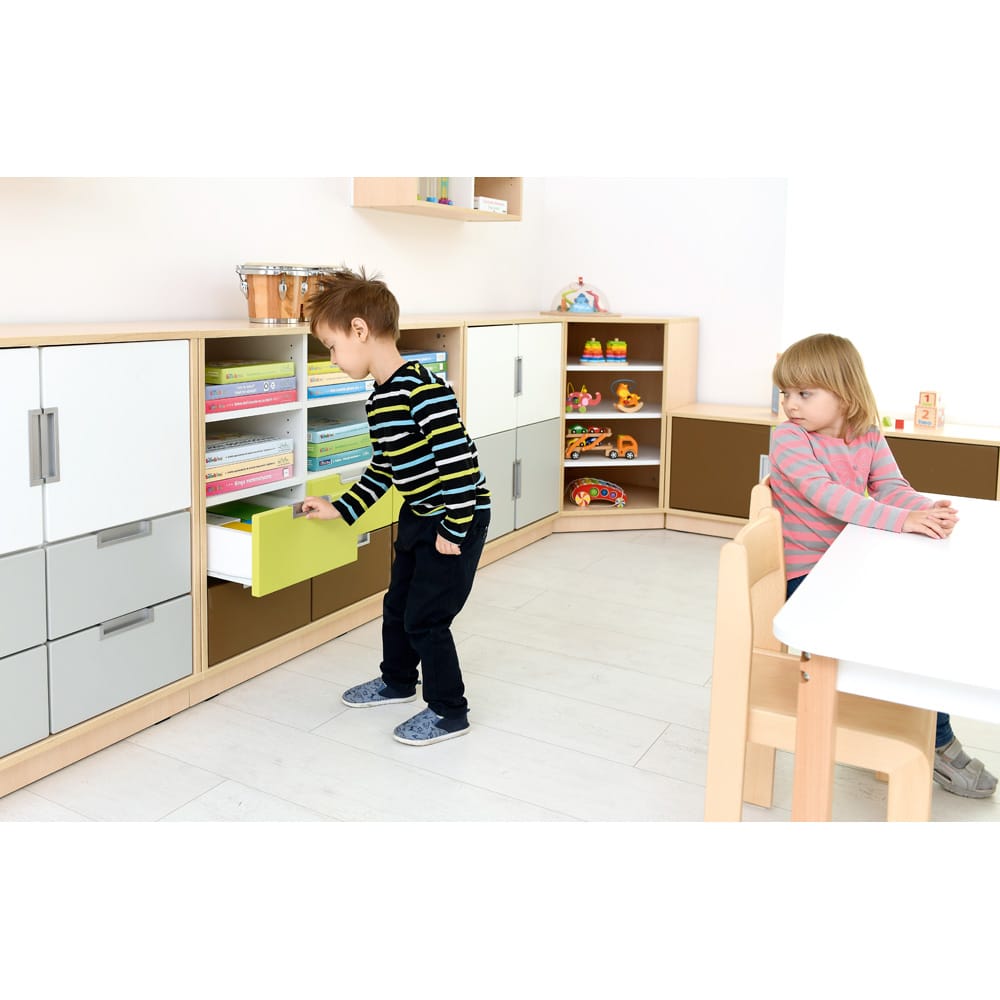 Die Quadro – Äußere Schublade schmal ist die perfekte Ergänzung für Ihre Quadro-Schränke. Ideal für Kindergärten, Schulen und Zuhause, bietet diese schmale Schublade zusätzlichen Stauraum und fügt sich nahtlos in Ihre Einrichtung ein.