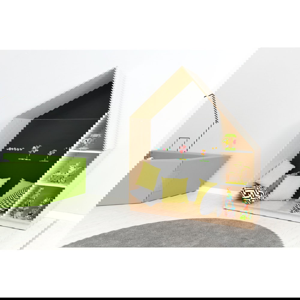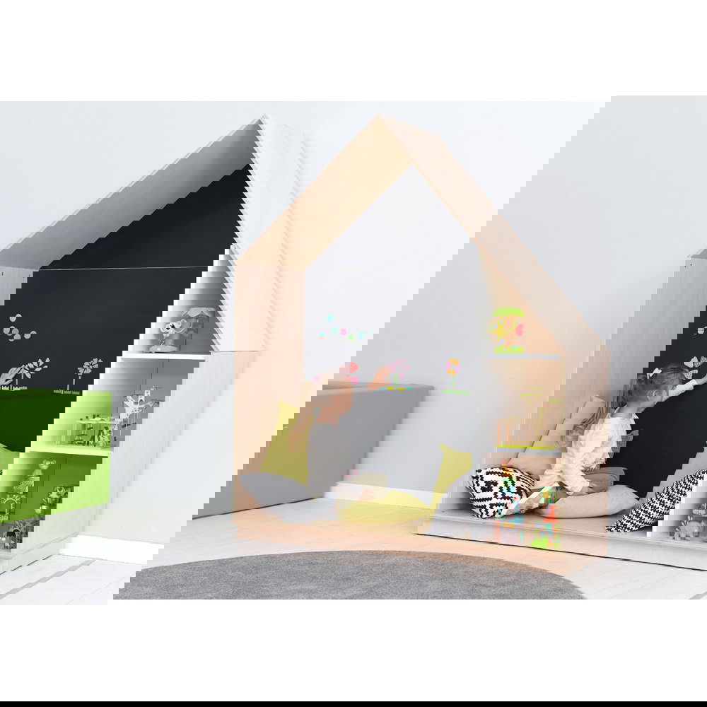 Das absolute Highlight für die kleinen Entdecker verbirgt sich jedoch im offenen Bereich: Die Rückwand ist schwarz und mit einer speziellen Magnetfarbe bestrichen. Diese multifunktionale Fläche lädt die Kinder dazu ein, mit Magneten zu experimentieren, Kunstwerke aufzuhängen oder erste Buchstaben und Zahlen spielerisch zu ordnen. Um den Aufenthalt im Häuschen noch bequemer zu gestalten, können Sie den Boden des offenen Bereichs mit unseren passgenauen Matten in der Breite 113 cm ausstatten (separat erhältlich). So entsteht im Handumdrehen eine weiche, warme Kuschel- und Lesehöhle.