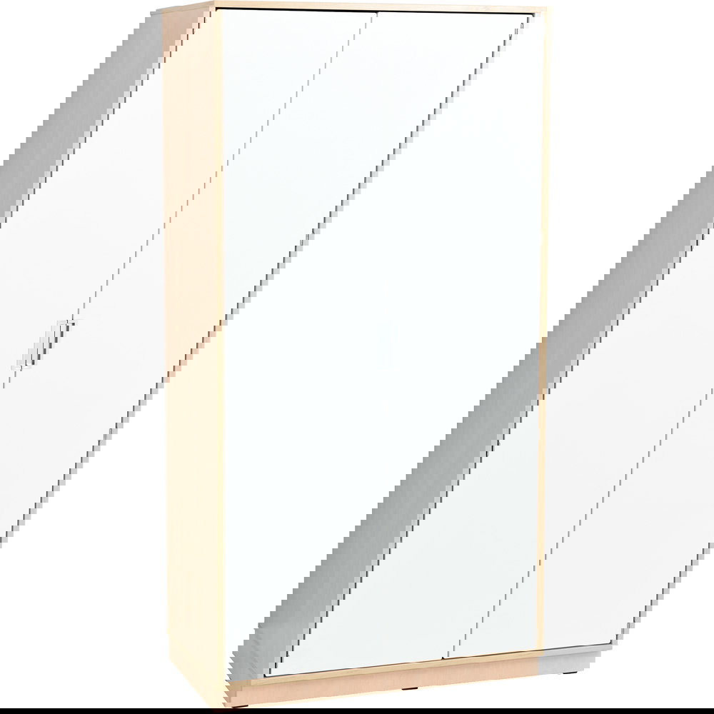 Wählen Sie zwischen einem Korpus in warmer Ahorn-Optik oder modernem Weiß, um den Schrank perfekt in Ihr Raumkonzept zu integrieren. Die Türen sind stets in einem neutralen, pflegeleichten Weiß gehalten und verleihen dem Hochschrank eine ruhige, aufgeräumte Ästhetik.