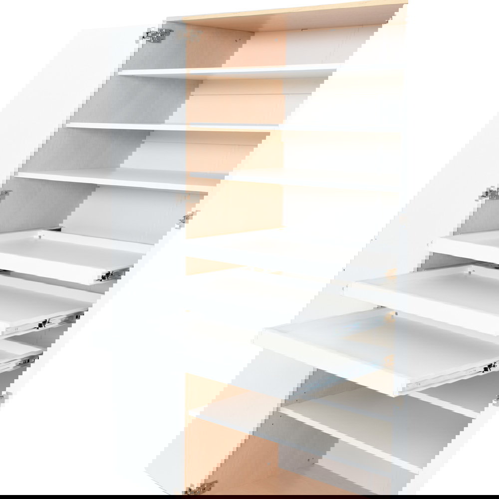 Das wahre Highlight dieses Schranks offenbart sich beim Öffnen. Er ist mit insgesamt acht breiten Einlegeböden ausgestattet, die eine flexible Einteilung ermöglichen. Drei dieser Böden sind als voll ausziehbare Schwerlastböden konzipiert. Diese lassen sich sanft herausziehen und bieten einen vollständigen Überblick über den Inhalt – selbst über die Gegenstände, die ganz hinten lagern. Kein umständliches Kramen und Umräumen mehr! Eine 4 cm hohe Aufkantung sorgt dafür, dass auch beim Herausziehen nichts herunterrutscht. Diese Funktion ist ideal für Papierstapel, Materialboxen oder schwere Geräte.