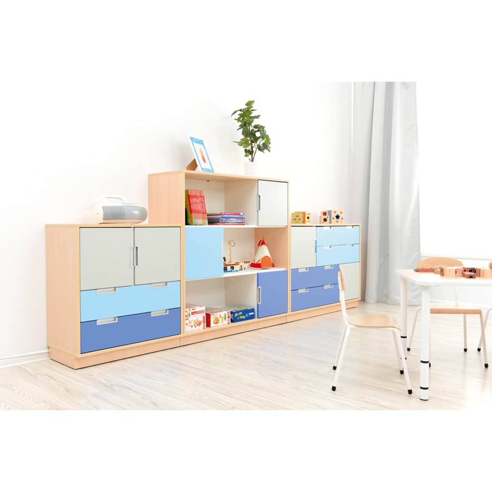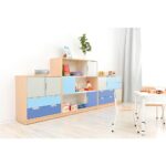 Der Quadro – Kombischrank M für 2 breite Schubladen, 79 cm bietet vielseitige und flexible Aufbewahrungslösungen für Kindergärten, Schulen und Zuhause. Dieser Schrank passt perfekt zu den breiten Schubladen und kann im oberen Teil zusätzlich mit Einlegeböden und Türen ergänzt werden.