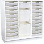 Dieses dreireihige Regal bietet Platz für eine Vielzahl an Kunststoffbehältern (372005-372026, 372034-372041, 372050-372073), die separat bestellbar sind. Die robuste Konstruktion sorgt für Stabilität und Langlebigkeit, während die weiße Ausführung der Mittelwände und Einlegeböden ein sauberes, modernes Erscheinungsbild verleiht.