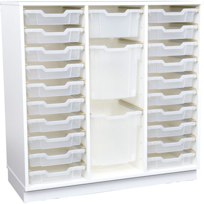 Das Quadro – Regal M+ für Kunststoffbehälter, Breite 104 cm, dreireihig bietet eine flexible und effiziente Aufbewahrungslösung für Kindergärten, Schulen und Zuhause. Die geräumigen Fächer ermöglichen eine individuelle Bestückung mit Kunststoffbehältern in verschiedenen Höhen, um Ihren Stauraum optimal zu nutzen.
