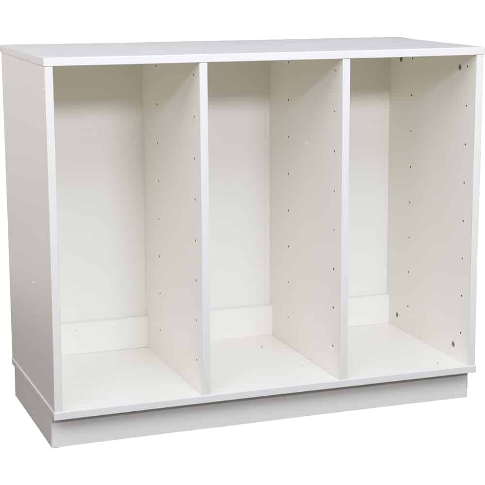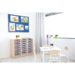 Das Quadro – Regal M für Kunststoffbehälter, 104 cm, dreireihig bietet die optimale Lösung für flexiblen und organisierten Stauraum in Kindergärten, Schulen und Zuhause. Die geräumigen Fächer sind ideal, um Kunststoffbehälter verschiedener Höhen unterzubringen und vielfältige Aufbewahrungsmöglichkeiten zu schaffen.