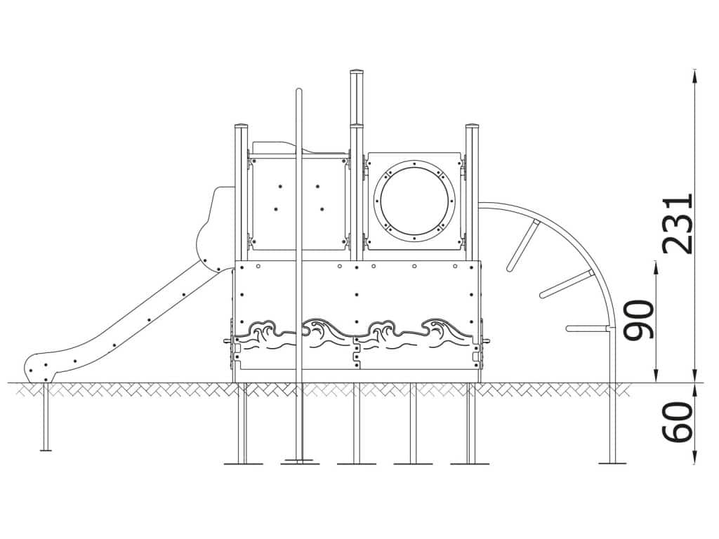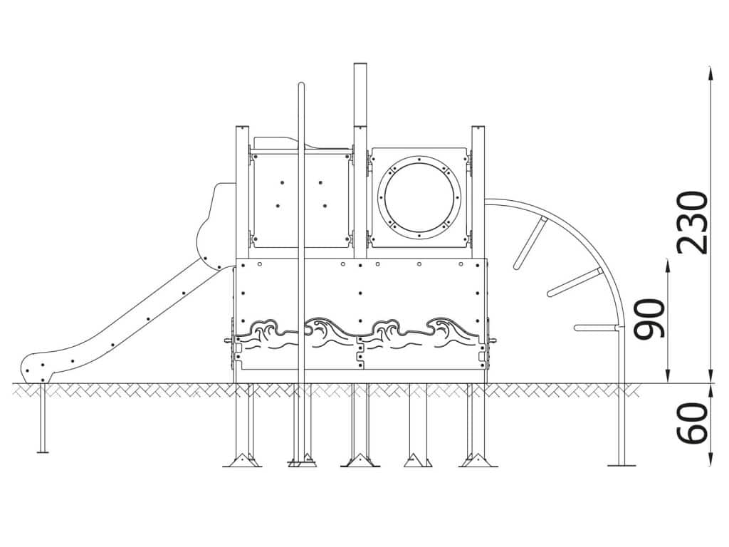 - Material Metall: Tragpfosten aus Vierkantstahlprofilen mit einem Kreuz 9x9xcm, direkt im Boden befestigt. Rutschfeste Plattformen. Dächer, Sicherheitselemente und Paneele werden aus HDPE-Platten (High Durable Polyethylen) mit Musterzuschnitten hergestellt. Gleitfläche aus säurebeständigem Edelstahlblech. Seile aus Polypropylen mit Stahlkern, Stärke 16-18 mm, vandalismus- und UV-beständig. Alle Fittings und Anschlüsse sind witterungs- und UV-beständig. Holzelemente werden geölt oder mit einer Farblasur überzogen. Stahlelemente sind mit Zinkschicht und Pulverlackierung gegen Korrosion geschützt.