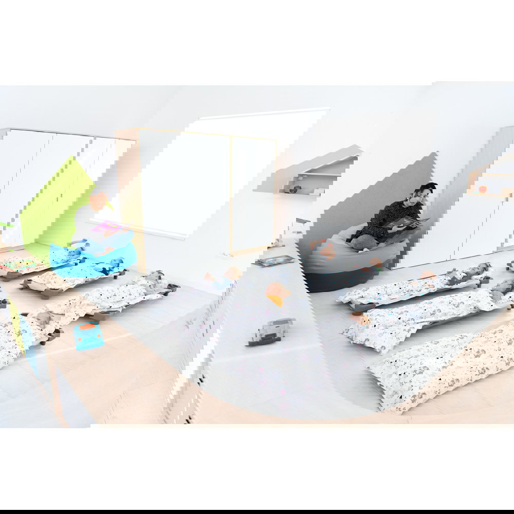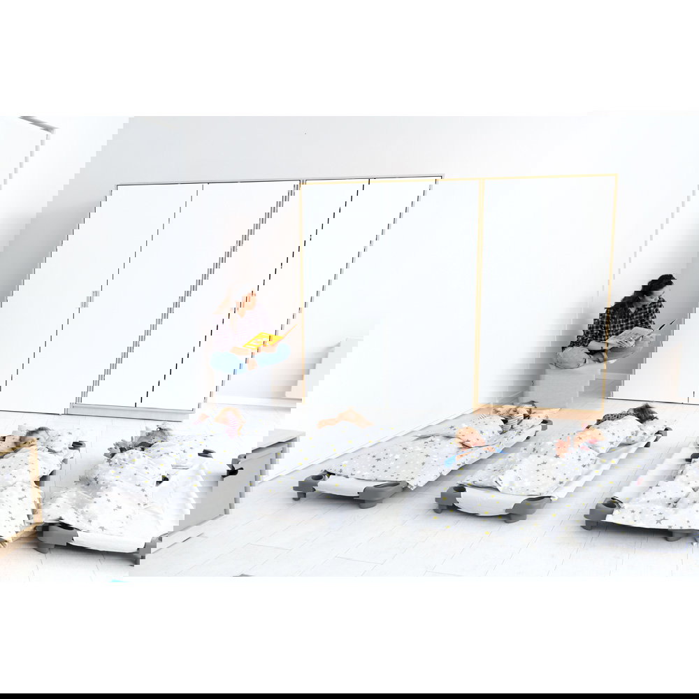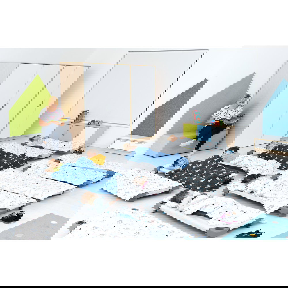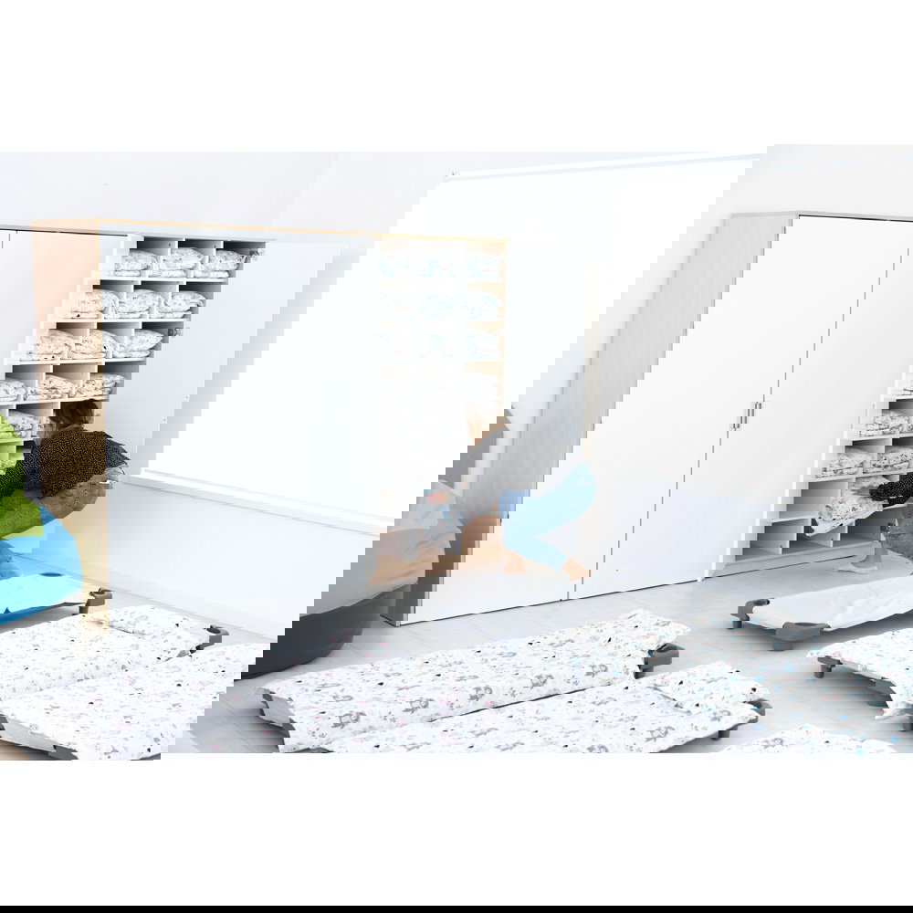 Der größte Vorteil dieses Systems ist seine unschlagbare Effizienz. Statt jedes Bett einzeln zu verstauen, fahren Sie den gesamten Stapel von 24 Betten auf dem passenden Transportwagen (separat bestellbar) einfach in den dafür vorgesehenen Schrank. Das Ein- und Ausräumen dauert nur noch wenige Augenblicke. So gewinnen Sie wertvolle Zeit, die Sie direkt den Kindern widmen können. - Komplettlösung für Betten und Wäsche