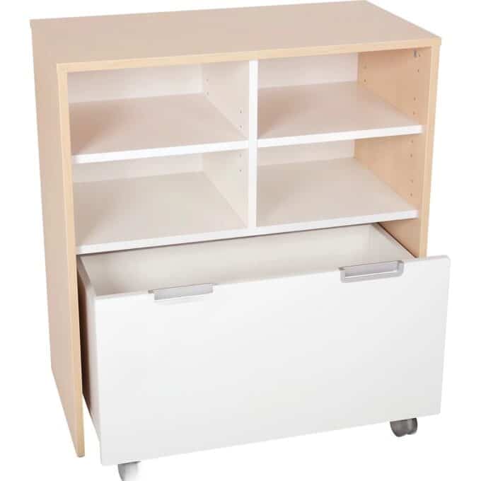 - Optimierter Stauraum Der untere Bereich des Schranks ist speziell auf Rollbehälter abgestimmt und bietet Platz für zwei schmale Rollbehälter (Breite 34 cm) oder einen breiten Rollbehälter (Breite 69 cm). Dadurch sind wichtige Utensilien stets gut organisiert und griffbereit.
