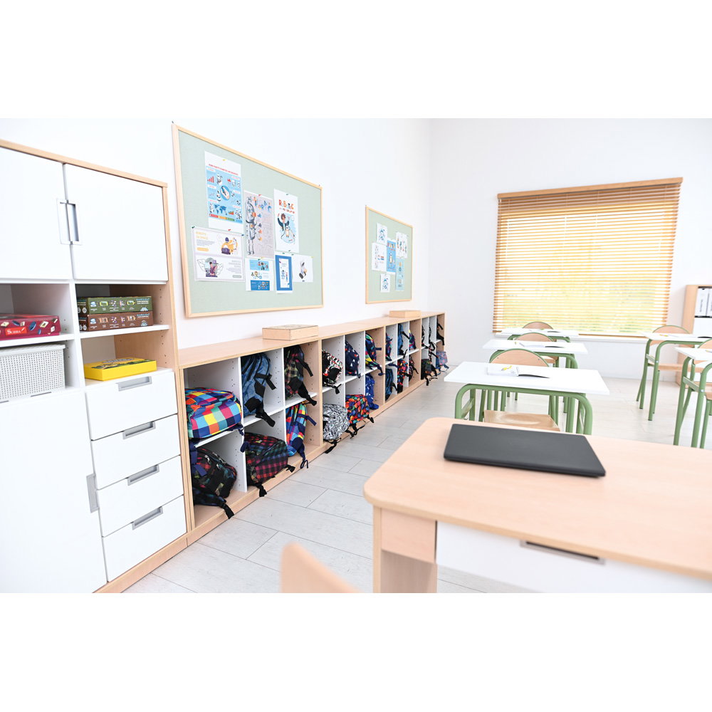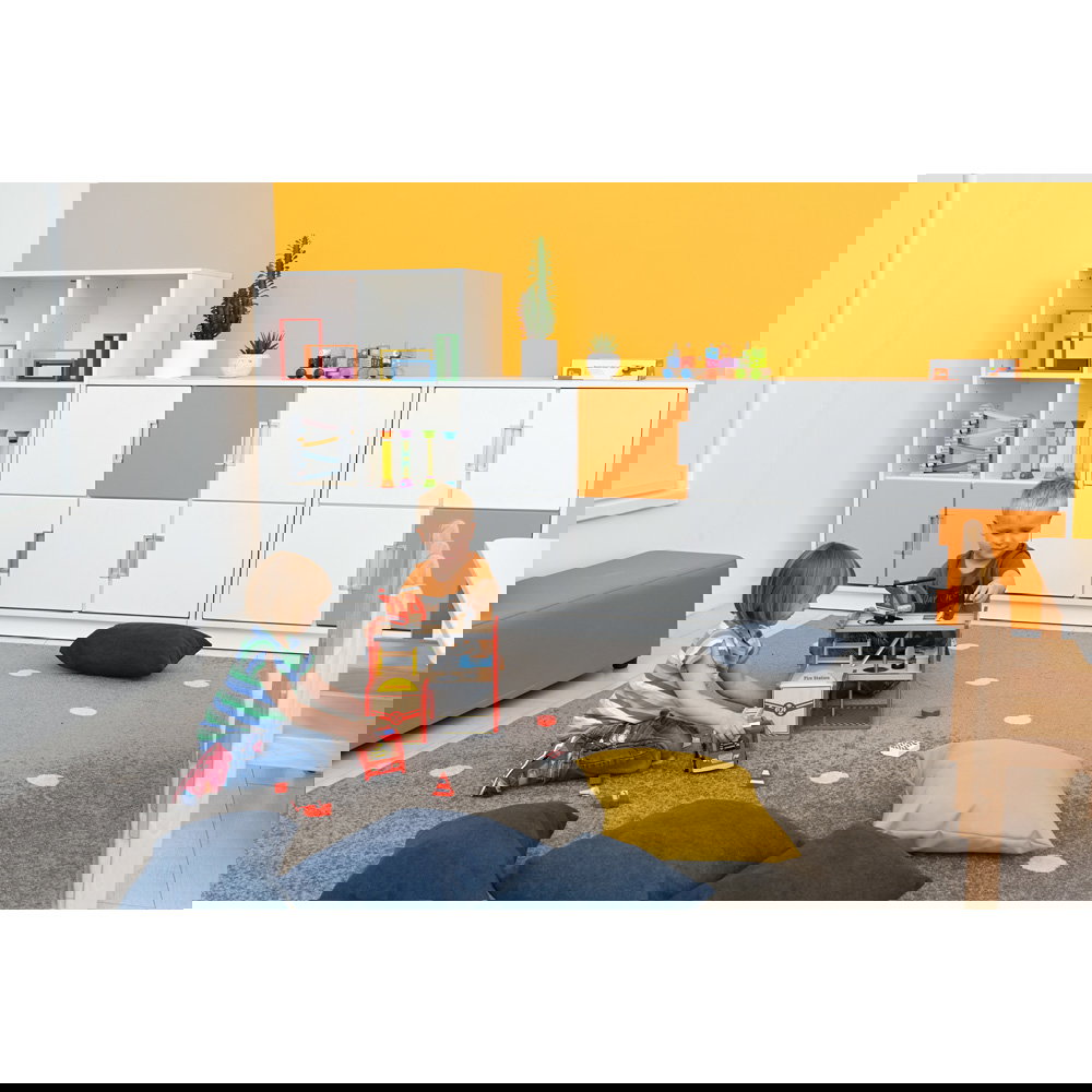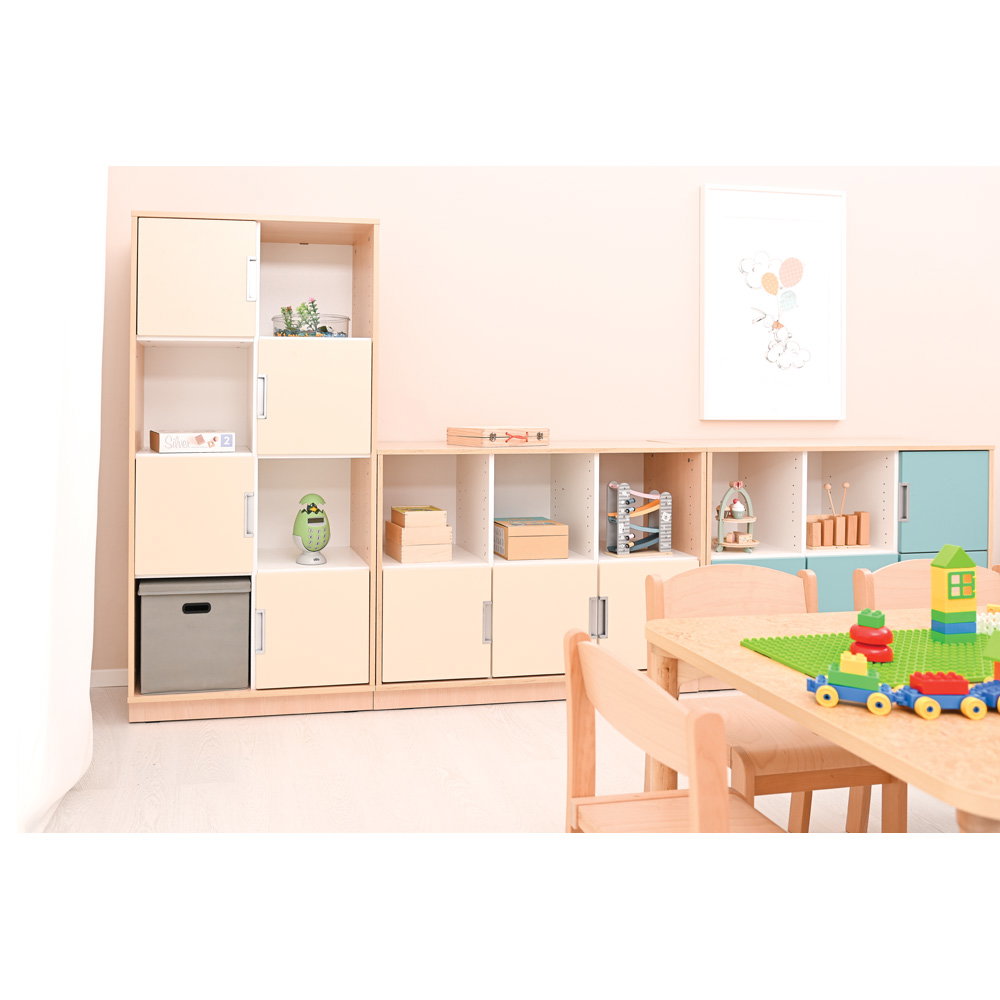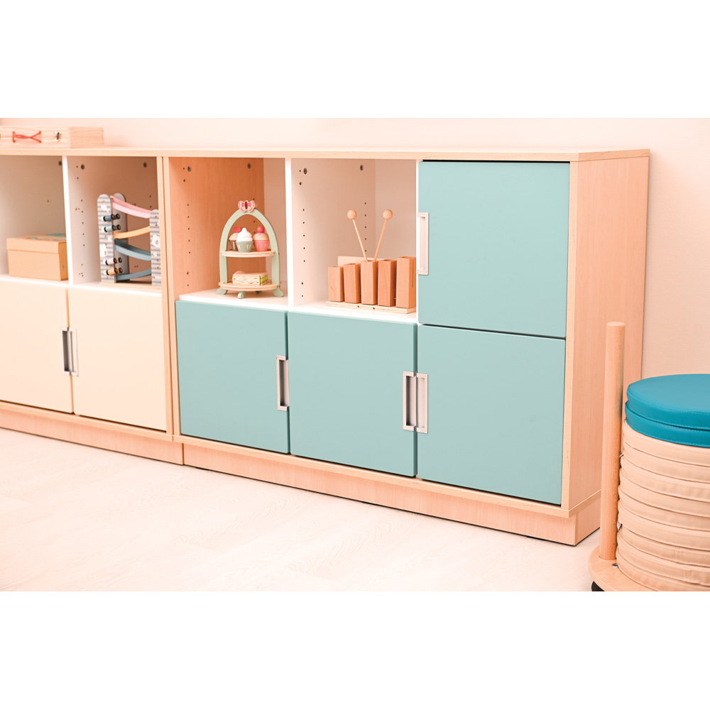 Neben seiner optischen Vielseitigkeit überzeugt der Quadro Schrank M durch eine robuste und langlebige Konstruktion. Der Korpus besteht aus einer 18 mm starken, hochwertig laminierten Spanplatte. Dieses widerstandsfähige Material verleiht dem Schrank genau die Stabilität, die Sie benötigen, um den intensiven Anforderungen in Bildungseinrichtungen oder Büros dauerhaft standzuhalten. Ein 8 cm hoher Sockelbereich sorgt für einen überaus sicheren Stand und schützt den unteren Bereich effektiv vor Schmutz und Stößen. Auch das Thema Hygiene kommt bei diesem Modell nicht zu kurz: Die glatten Oberflächen lassen sich unkompliziert pflegen. Sie können den Schrank problemlos mit schonenden, für Möbeloberflächen geeigneten Präparaten (mit geringer Alkoholkonzentration) hygienisch desinfizieren.