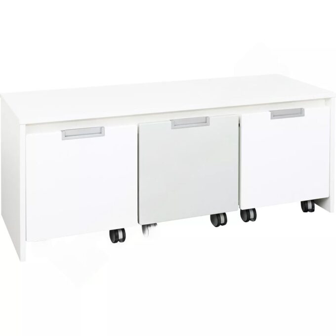 Dank hochwertiger Materialien wie laminiertem Spanplattenkorpus in Weiß oder Ahorn-Dekor überzeugt der Schrank nicht nur durch Langlebigkeit, sondern auch durch seine pflegeleichten Eigenschaften. Entwickelt für maximalen Komfort und Flexibilität, lassen sich die passenden Rollbehälter einfach integrieren, damit alle Utensilien übersichtlich verstaut sind und der Raum stets aufgeräumt wirkt.