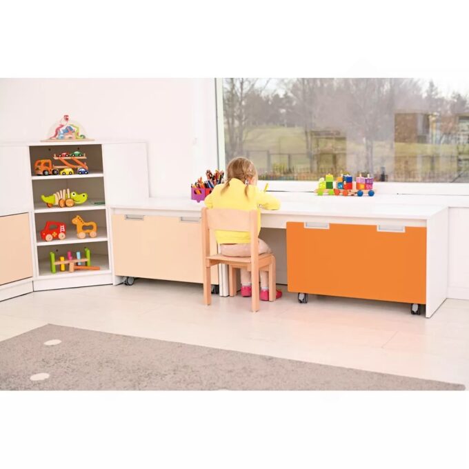 - Umwandlung in einen Tisch Ohne Rollbehälter kann der Schrank als stabiler Tisch mit einer passenden Sitzhöhe für Stühle mit Sitzhöhe von 31 cm (Größe 2) verwendet werden. Dies macht ihn zu einer praktischen Ergänzung in jedem Raumkonzept.