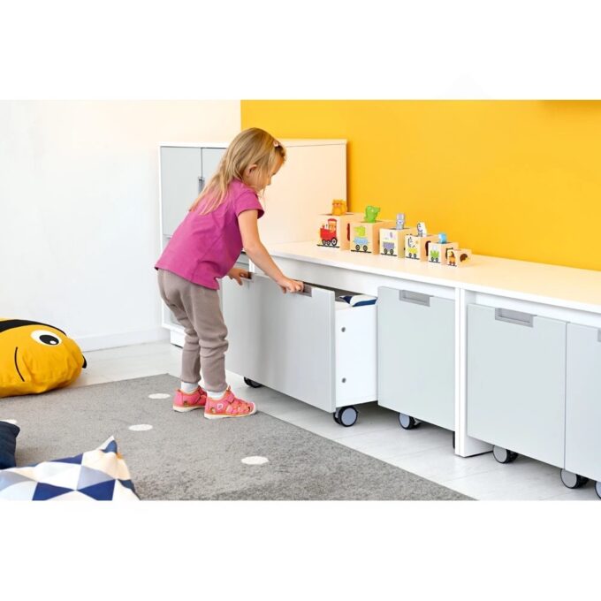 Der Quadro – Schrank S für Rollbehälter ist die ideale Lösung für eine platzsparende und flexible Aufbewahrung, die vielseitig einsetzbar ist und gleichzeitig durch ihr zeitloses Design überzeugt. Er fügt sich harmonisch in jede Umgebung ein, sei es im Kinderzimmer, Schulbereich oder Büro. Der Schrank kombiniert praktischen Stauraum mit einer multifunktionalen Nutzung als Sitzbank oder Tisch, wodurch er sowohl für Kinder als auch Erwachsene perfekt geeignet ist.
