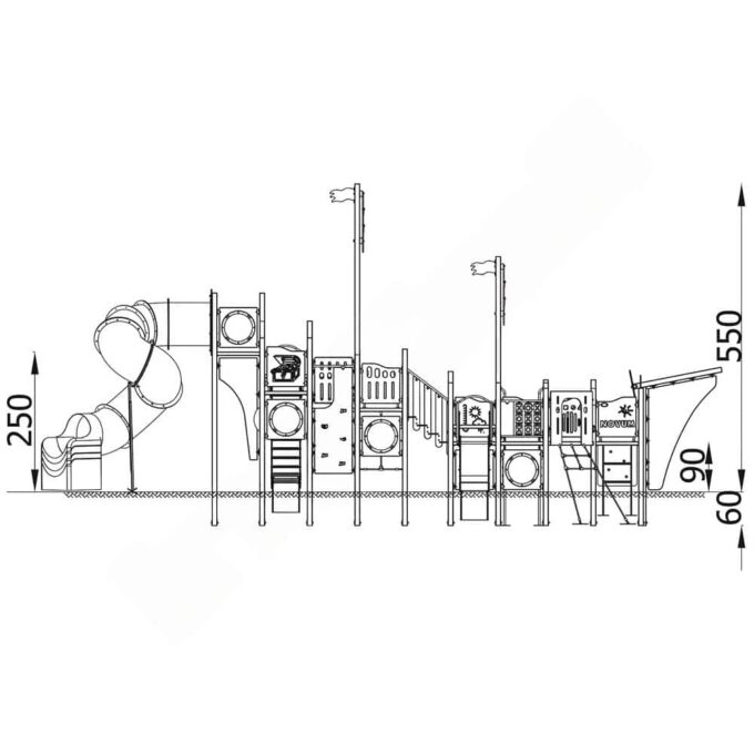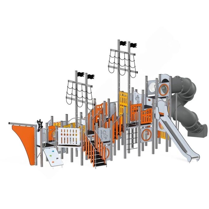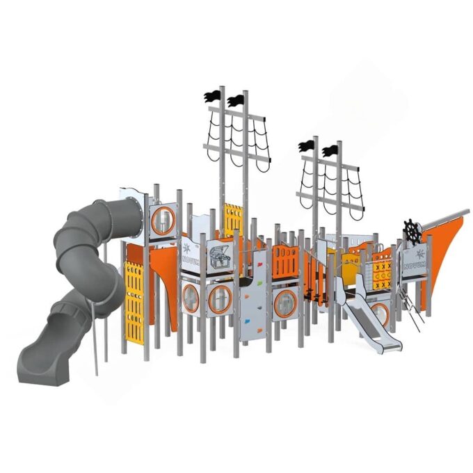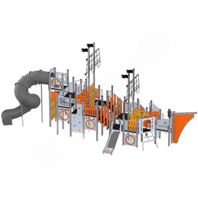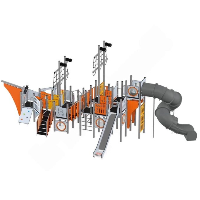 Das Riesenschiff ist mehr als nur ein Spielgerät – es ist ein Abenteuerland! Die niedrigen Podeste und einfachen Treppenaufgänge mit Geländern ermöglichen Sicherheit für die Jüngsten, während hohe Kletterwände und Türme große Herausforderungen für die Älteren bieten. Kinder können sich an verschiedenen Aufgängen (Kletterwände, Kletternetze, Treppen und Leitersprossen) ausprobieren und ihre Fähigkeiten weiterentwickeln.