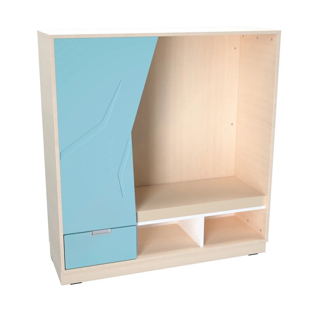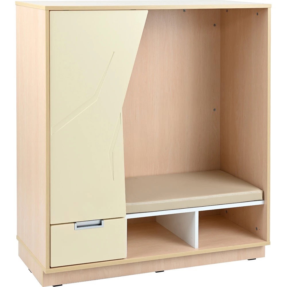 Das Design vereint Funktionalität mit einer einladenden Ästhetik. Während die offenen Fächer und die Schublade Platz für Bücher, Spielzeug oder Bastelmaterial bieten, lädt die integrierte Sitznische mit ihrer weichen, beigefarbenen Schaumstoffmatte zum Verweilen ein. Die Kombination aus hellem Ahorn-Dekor, klarem Weiß und farbigen Akzenten schafft eine freundliche Atmosphäre, die sich nahtlos in moderne Raumkonzepte einfügt. Hier finden Kinder einen eigenen, kleinen Platz in der großen Gruppe.