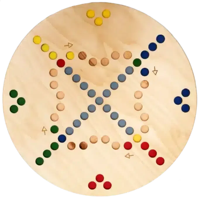 Das Quer durch – „QU4“ (rund) überzeugt mit einem übersichtlich gestalteten, runden Spielbrett und handlichen Spielfiguren, die dank der Vertiefungen im Sperrholz sicher stehen bleiben. Jeder Spieler startet mit 3 Figuren seiner Farbe und würfelt reihum, um als Erster das Ziel zu erreichen. Der Spielverlauf folgt der Rundung des Spielbretts, was zusätzliche Spannung und Dynamik verleiht.