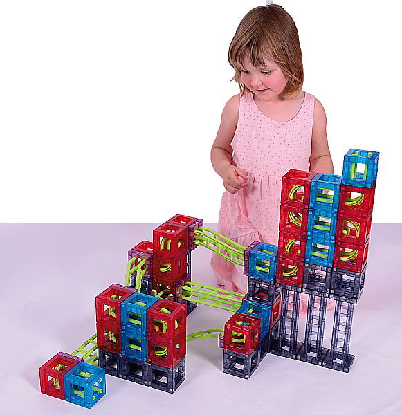 - Stabilität und Flexibilität: Trotz der Flexibilität beim Bauen halten die Magnete die Bahn stabil zusammen, sodass auch waghalsige Konstruktionen dem Lauf der Kugel standhalten.