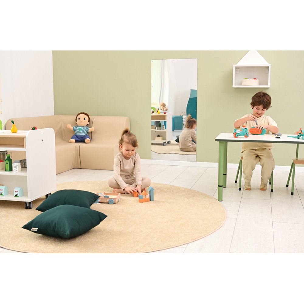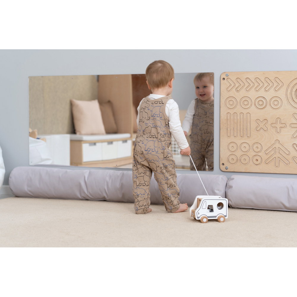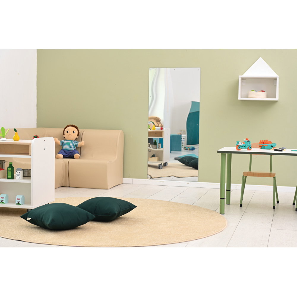 Das minimalistische Design ohne störenden Rahmen lenkt den Fokus vollständig auf das Spiegelbild. Diese Reduktion auf das Wesentliche ist besonders wertvoll in der sensorischen Integrationstherapie oder bei Konzentrationsübungen. Ob als einzelnes Element zur Förderung der Körperkoordination oder als großflächige Spiegelwand durch die Kombination mehrerer Module – dieser Sicherheitsspiegel passt sich flexibel Ihren räumlichen und pädagogischen Anforderungen an. Erhältlich in zwei praktischen Formaten (130 x 60 cm und 60 x 80 cm), bietet er vielfältige Einsatzmöglichkeiten von der Logopädie bis hin zum freien Spiel.