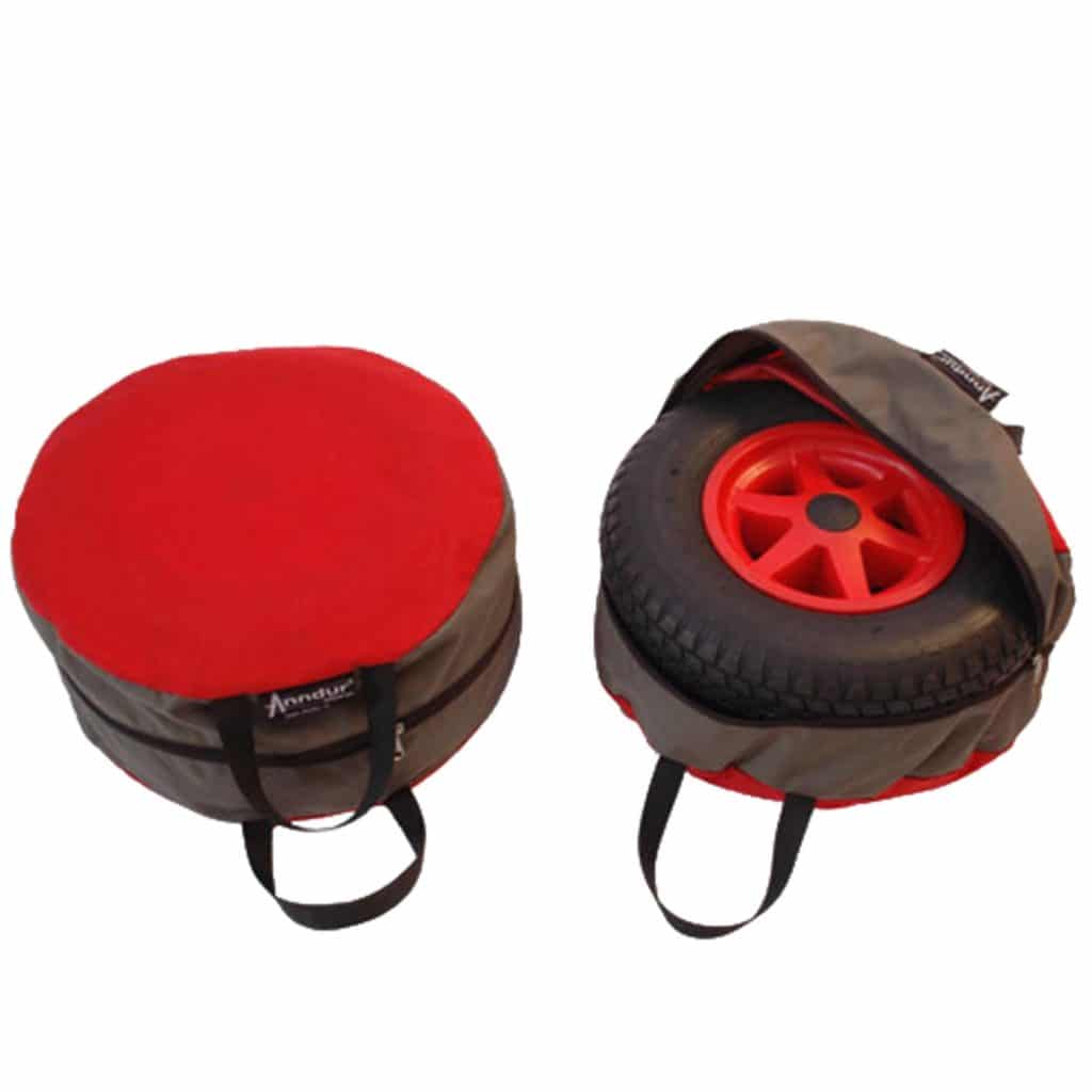Die vier Räder des Rambler Bollerwagen können komfortabel in diesen passenden Radtaschen transportiert werden. Die Radtaschen bestehen aus einem Set aus zwei Taschen, wobei zwei Räder in eine Tasche passen. Einfach mit einem Reißverschluss verschließen und mit dem Doppelgriff wie mit einer Einkaufstüte losziehen (nur leichter). Diese Radtaschen können perfekt in Verbindung mit der Transporttasche des Rambler Bollerwagens verwendet werden.