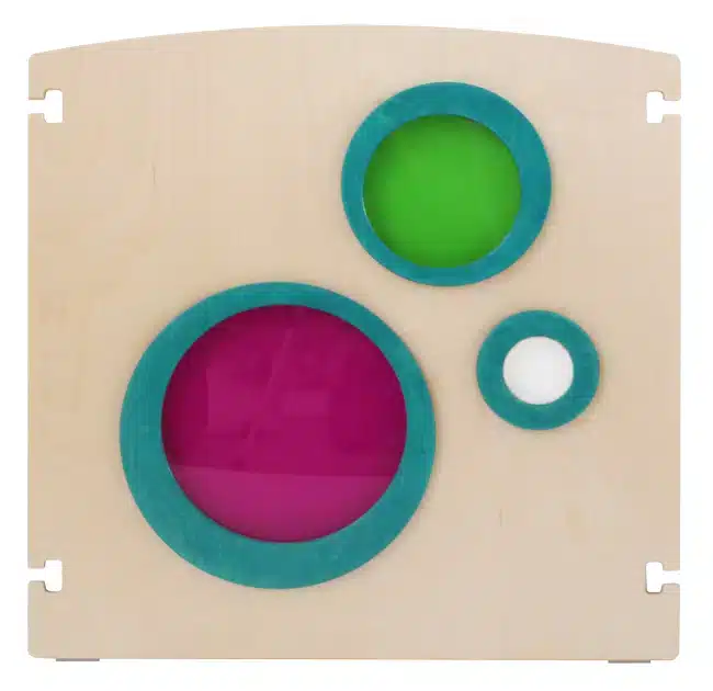 Durchblick ist ein Raumteiler mit 3 unterschiedlich großen Kreisen. Schaut das Kind durch die farbigen Kreise, macht es eine interessante Entdeckung. Alles sieht entweder grün oder rot (Magenta) aus. Das kleine Fenster ist offen. Dadurch bietet sich ein Vergleich zu den farbigen Kreisen.