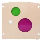 Raumteiler „Durchblick“ von Holz Klang & Spiel – 75 × 75 cm, mit drei farbigen Kreisen (Grün/Magenta). Beidseitig bespielbar, ideal für Kita & Spielräume