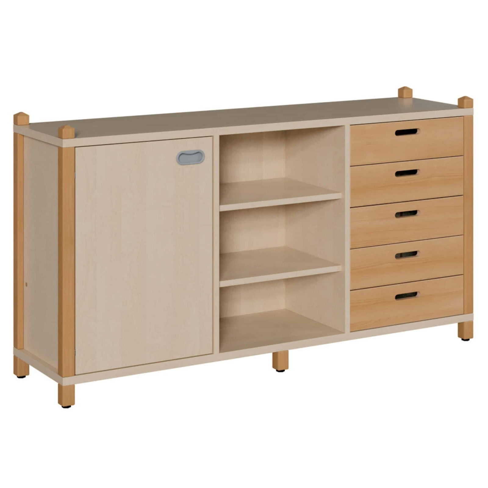 Erleben Sie die perfekte Balance aus natürlicher Schönheit, flexibler Ordnung und durchdachter Funktionalität. Dieser Raumteilerschrank in massiver Stollenbauweise ist ein wahres Multitalent, das die besten Eigenschaften verschiedener Möbelstücke in einem eleganten Design vereint. Er kombiniert die warme Ausstrahlung von fünf hochwertigen Massivholzschüben mit dem geschützten Stauraum einer Tür und einem offenen Mittelregal für alles, was schnell zur Hand sein muss. Dieses asymmetrische Design schafft nicht nur eine spannende Optik, sondern bietet auch eine unübertroffene Vielfalt an Organisationsmöglichkeiten. Gebaut für höchste Ansprüche, ist er die ideale Wahl für Kitas, Schulen und alle Räume, in denen Struktur und Stil Hand in Hand gehen.