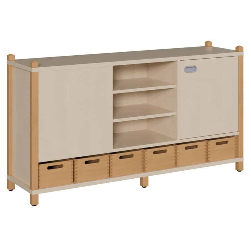 - Vielseitiger Stauraum: Ob Bastelutensilien, Schreibwaren, Bücher oder Spiele – in diesem Schrank findet alles seinen Platz. Die Kombination aus mobilen Kästen und geschütztem Stauraum hinter der Tür erleichtert das Aufräumen und fördert die Selbstständigkeit der Kinder.