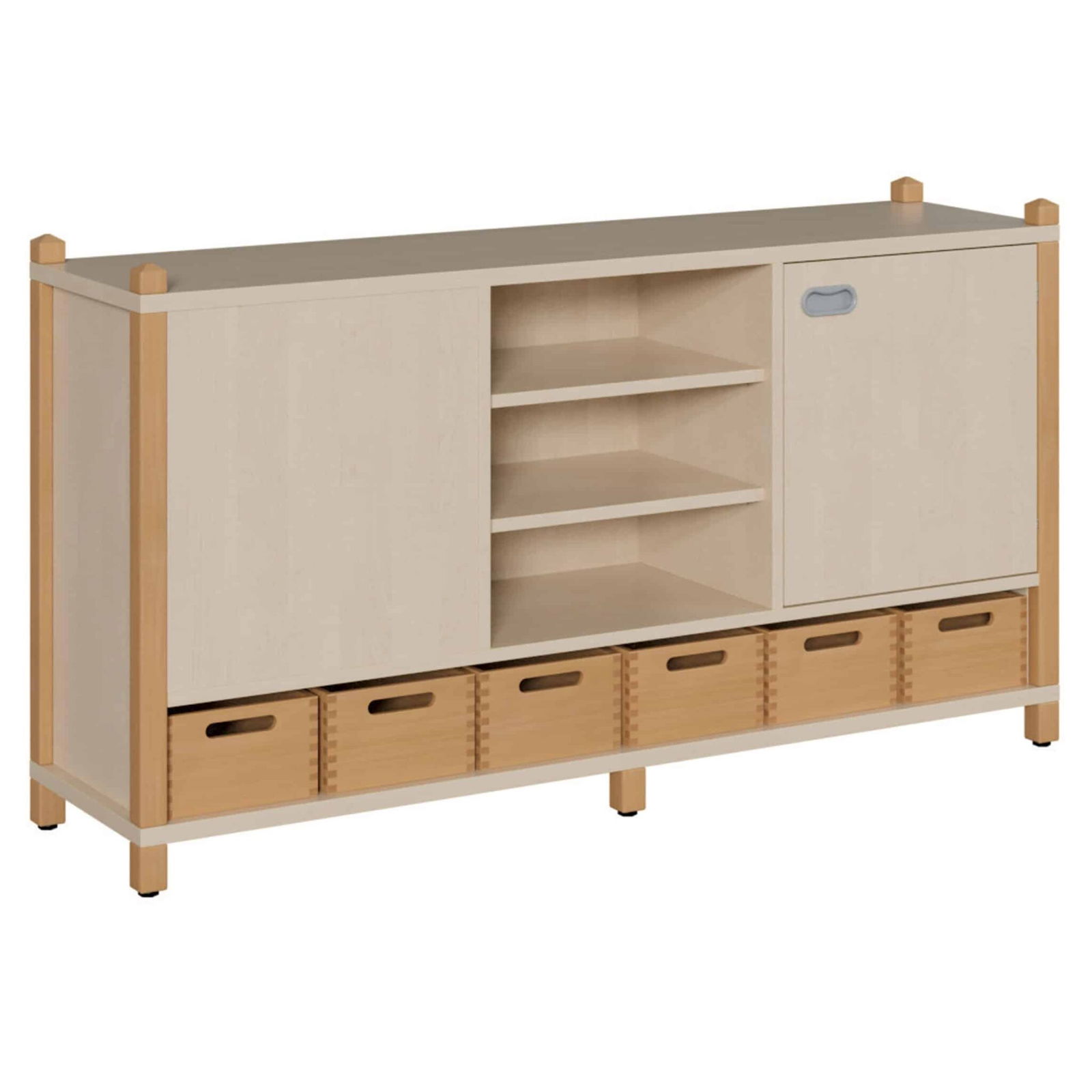 - Interaktives Mittelstück: Das mittlere Segment ohne Rückwand fungiert als Brücke zwischen zwei Bereichen. Kinder können von beiden Seiten darauf zugreifen, hindurchschauen und miteinander interagieren. Es wird zum kommunikativen Zentrum des Raumes.