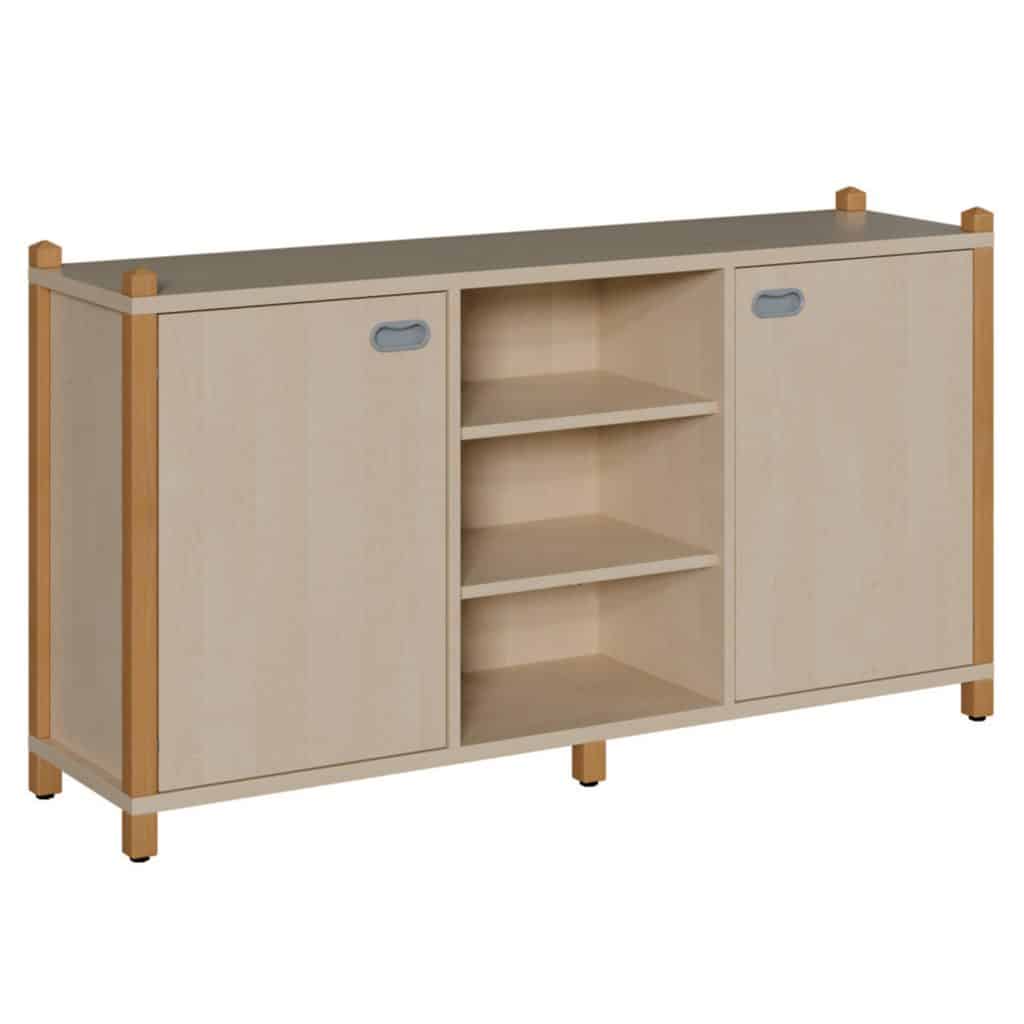 Schaffen Sie strukturierte, einladende und funktionale Räume mit diesem eleganten Raumteilerschrank. Er ist die perfekte Lösung, um große Zimmer in gemütliche Spiel- oder Lernecken zu verwandeln, ohne das offene und helle Ambiente zu verlieren. Dieses Möbelstück kombiniert auf meisterhafte Weise verdeckten Stauraum hinter zwei Türen mit offenen, leicht zugänglichen Regalfächern in der Mitte. Getragen von einer massiven Stollenkonstruktion aus Buchenholz und ausgestattet mit durchdachten Details wie höhenverstellbaren Füßen, bietet dieser Schrank nicht nur enorm viel Platz, sondern auch unübertroffene Stabilität und Sicherheit für den anspruchsvollen Alltag in Kitas und Schulen.