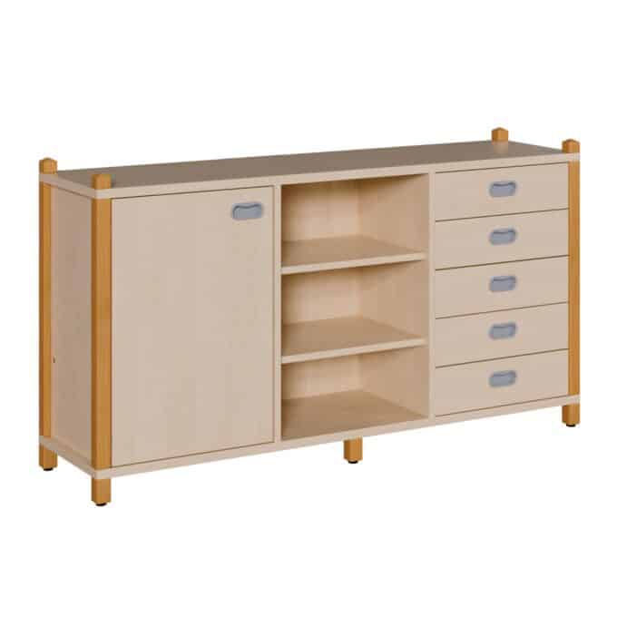 Entdecken Sie ein Möbelstück, das die Organisation Ihrer Räume revolutioniert und gleichzeitig als stilvolles Designelement dient. Dieser Kombinationsschrank in massiver Stollenbauweise ist ein wahres Multitalent, das drei essenzielle Funktionsbereiche in einem einzigen, harmonischen Möbelstück vereint. Er bietet fünf geräumige Schubladen für kleinteilige Ordnung, einen blickdichten Bereich hinter einer Tür für geschützten Stauraum und ein offenes, flexibles Mittelregal für Bücher und schnell zugängliche Materialien. Mit seiner robusten Konstruktion, den hochwertigen Materialien und den vielfältigen Gestaltungsmöglichkeiten ist dieser Schrank die ideale Lösung für anspruchsvolle Umgebungen wie Kitas, Schulen und Gruppenräume, in denen sowohl Funktionalität als auch Ästhetik eine zentrale Rolle spielen.