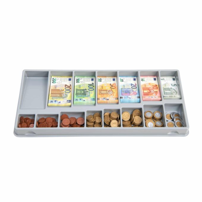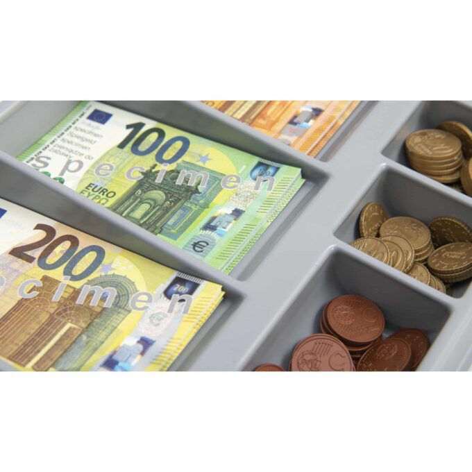 Das Rechengeld-Set beinhaltet alles, was Ihre Schüler brauchen, um die Werte von Euro-Scheinen und -Münzen zu erfassen. Die Fächer in der Eurokasse sind ideal sortiert, um einen schnellen Zugriff zu gewährleisten. Ihre Schüler lernen durch praktische Übungen, wie sie im Alltag mit Geld umgehen, inklusive dem Erkennen von Preisen und dem Berechnen von Wechselgeld.
